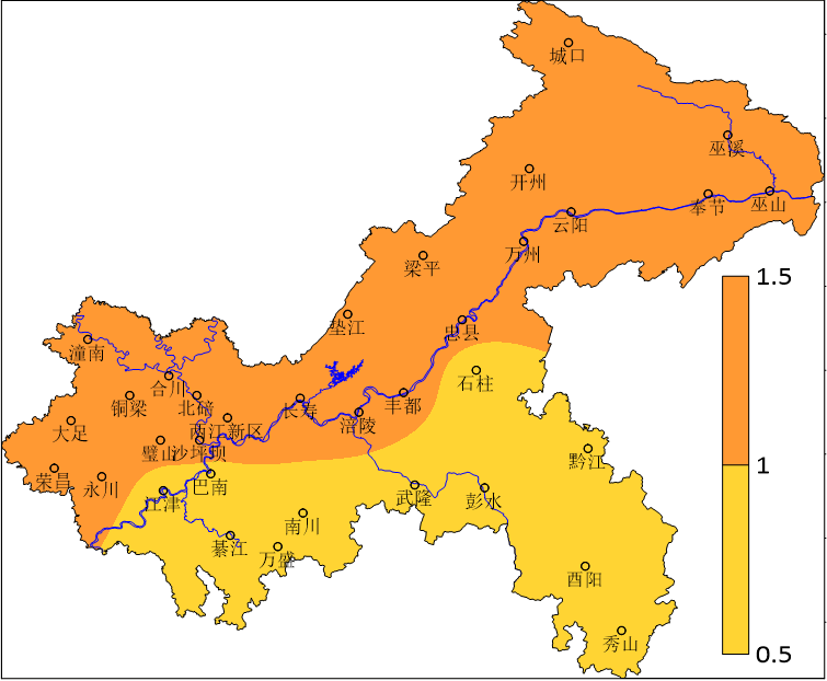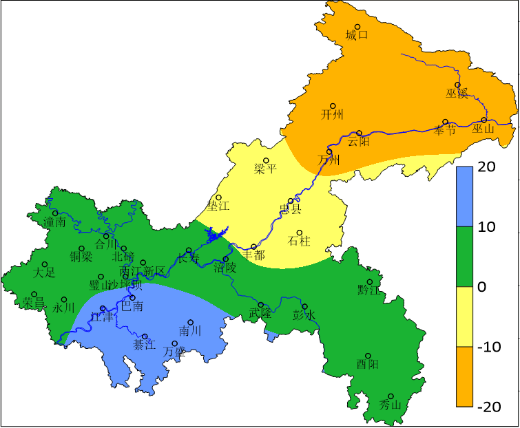3. 中部局部地区有气象干旱。预计春季我市中部的垫江、长寿和涪陵等地可能出现20~29天轻度气象干旱。