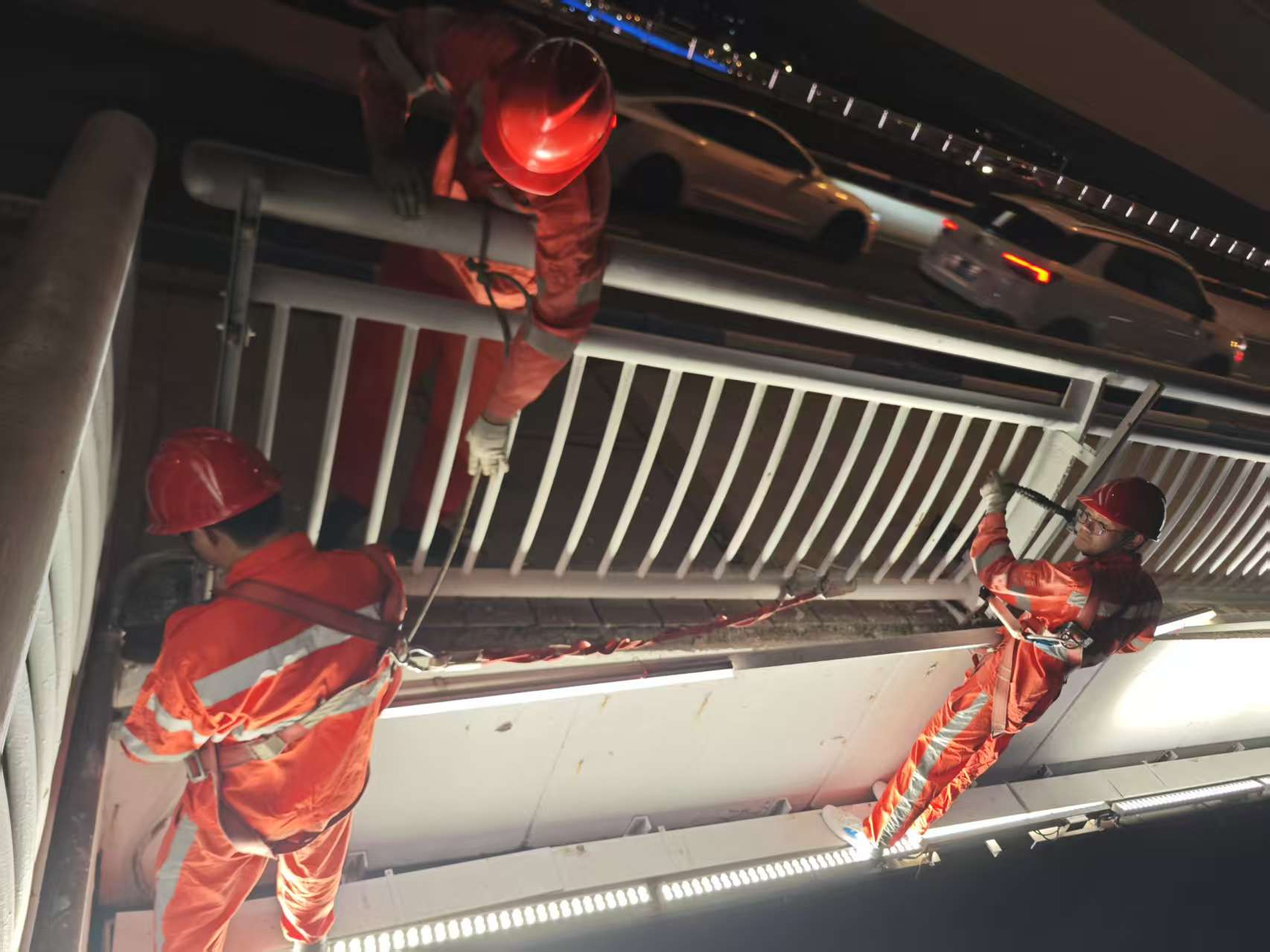 三是严格巡查,全程管控稳质量。施工期间,累计完成2400余套大桥护栏灯具、1800余米线缆桥架的拆除及恢复安装工作,实现“零安全事故、零设施损坏、零景观断供”的目标。有力保障了水管改造工程按期推进,确保桥梁景观照明正常启闭。