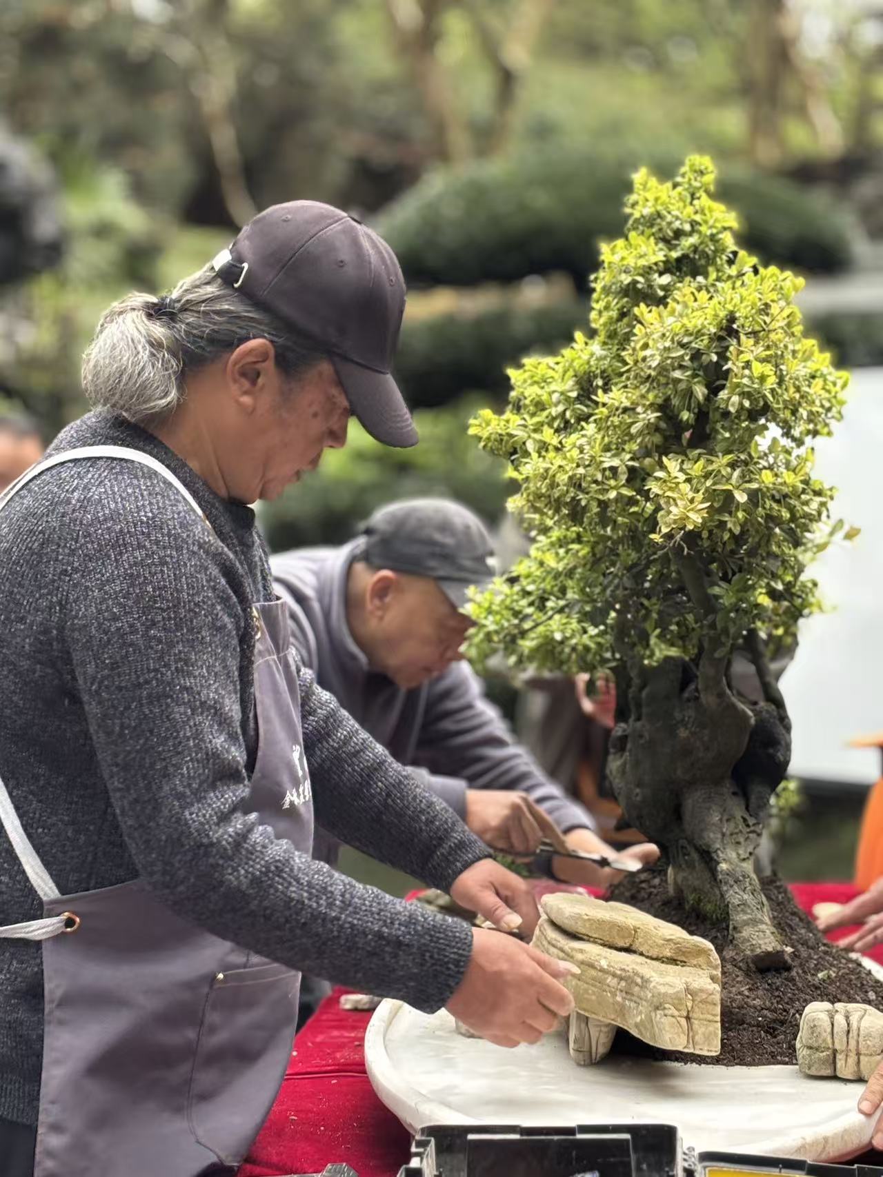 活动现场由盆景大师从盆景的定义、主要类型和流派各方面向大家进行了讲解,重点介绍水旱盆景的立意、选材、制作方法及流程等,同时演示水旱盆景的制作全过程。在现场操作中,大师从选材立意、布局构图到造型修剪,将普通的石材、绿植与苔藓巧妙组合,生动诠释了“缩地成寸、小中见大”的艺术境界,并同步讲解了山水意境营造的要点。制作现场,观众纷纷围绕大师提问,大师耐心解答并分享了多年的创作心得,现场形成了浓厚的盆景技艺和文化交流氛围。此次活动通过“大师演示+技术讲解+互动答疑”的模式,不仅让参与者近距离感受了盆景艺术的匠心精神,更有效推动了传统技艺与大众生活的深度融合。