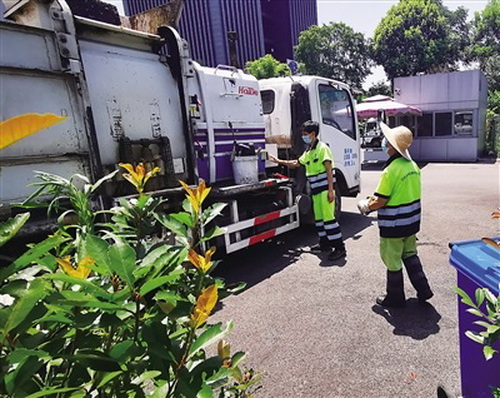 搬运、卸装垃圾桶,醒目的荧光色工作服……原来,龚金明是一名环卫工。