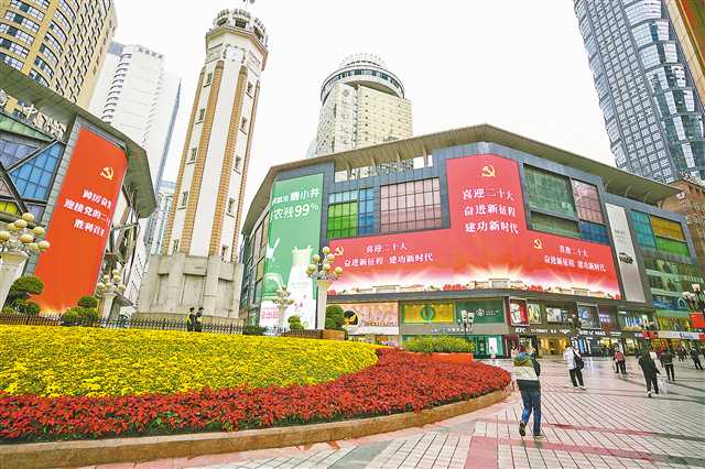 十月九日,解放碑步行街,鲜花标语等营造出喜迎二十大的浓厚氛围。记者 谢智强 摄\视觉重庆