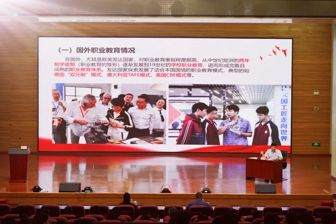 在核心授课环节,王吉华书记通过“三维视角”与“双向激励”,为学生搭建起认知职业教育、认同学校发展的清晰框架。他首先从国外职业教育的成熟模式、国内职业教育的政策红利、重庆职业教育的特色路径三个维度展开,结合德国双元制、我国“职教高考”改革等实例,让学生深刻理解“职业教育不是‘退路’,而是‘赛道’”,打破对职业教育的认知误区;随后,他以学校发展历程中“五个了不起”为主脉络,从办学历史的厚重积淀、师资团队的专业实力等方面,全方位展现学校育人硬实力,让学生对未来学习充满期待。