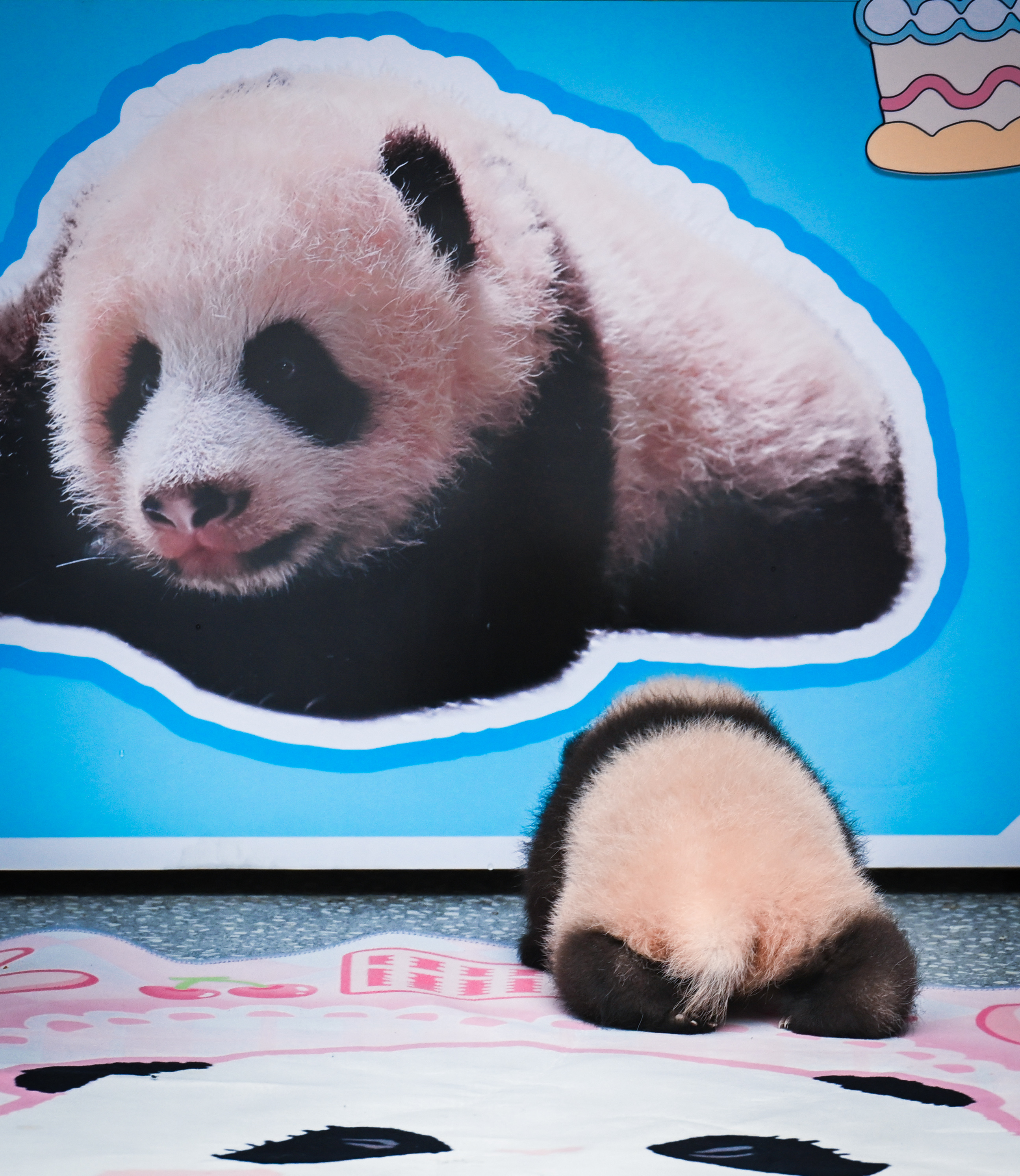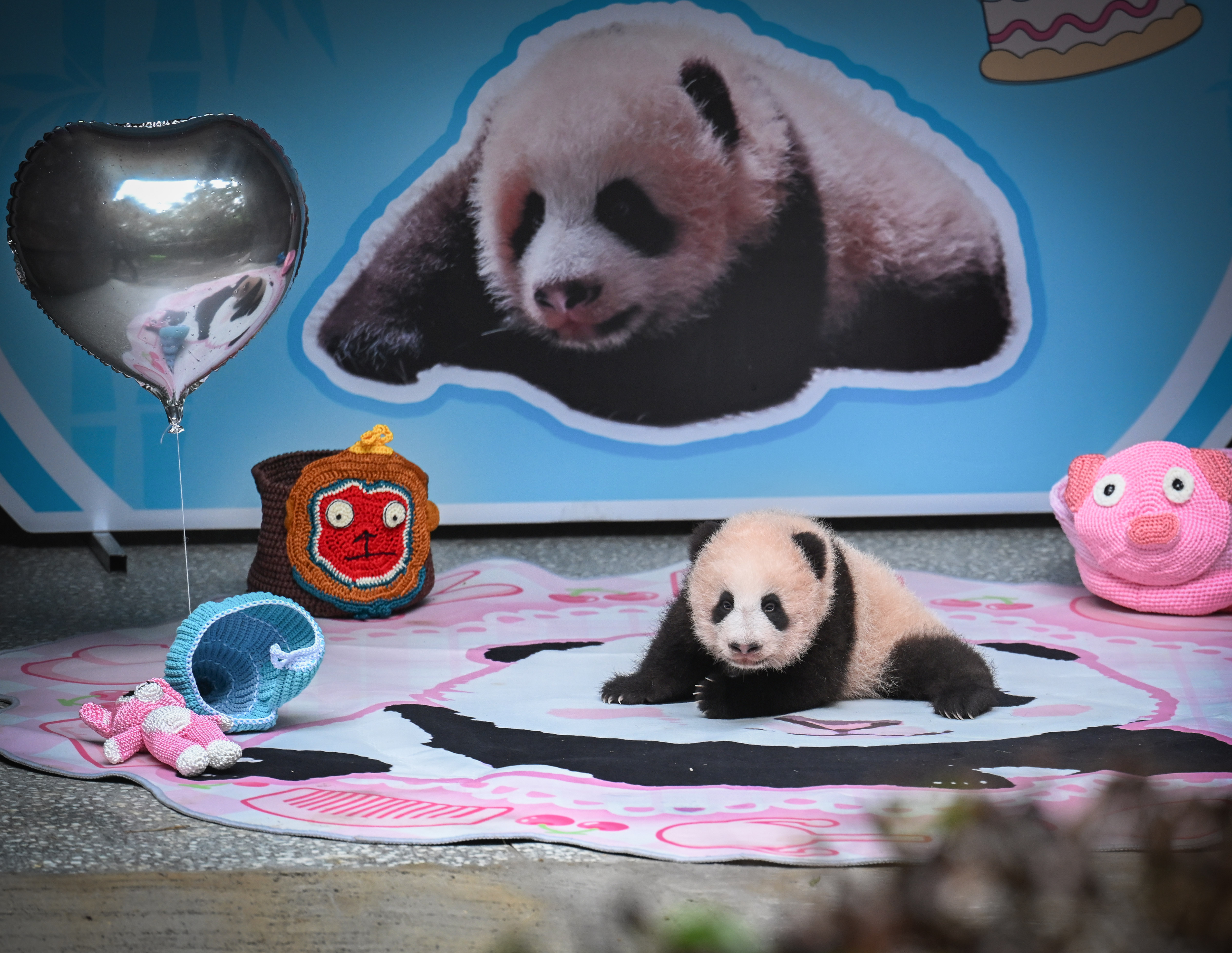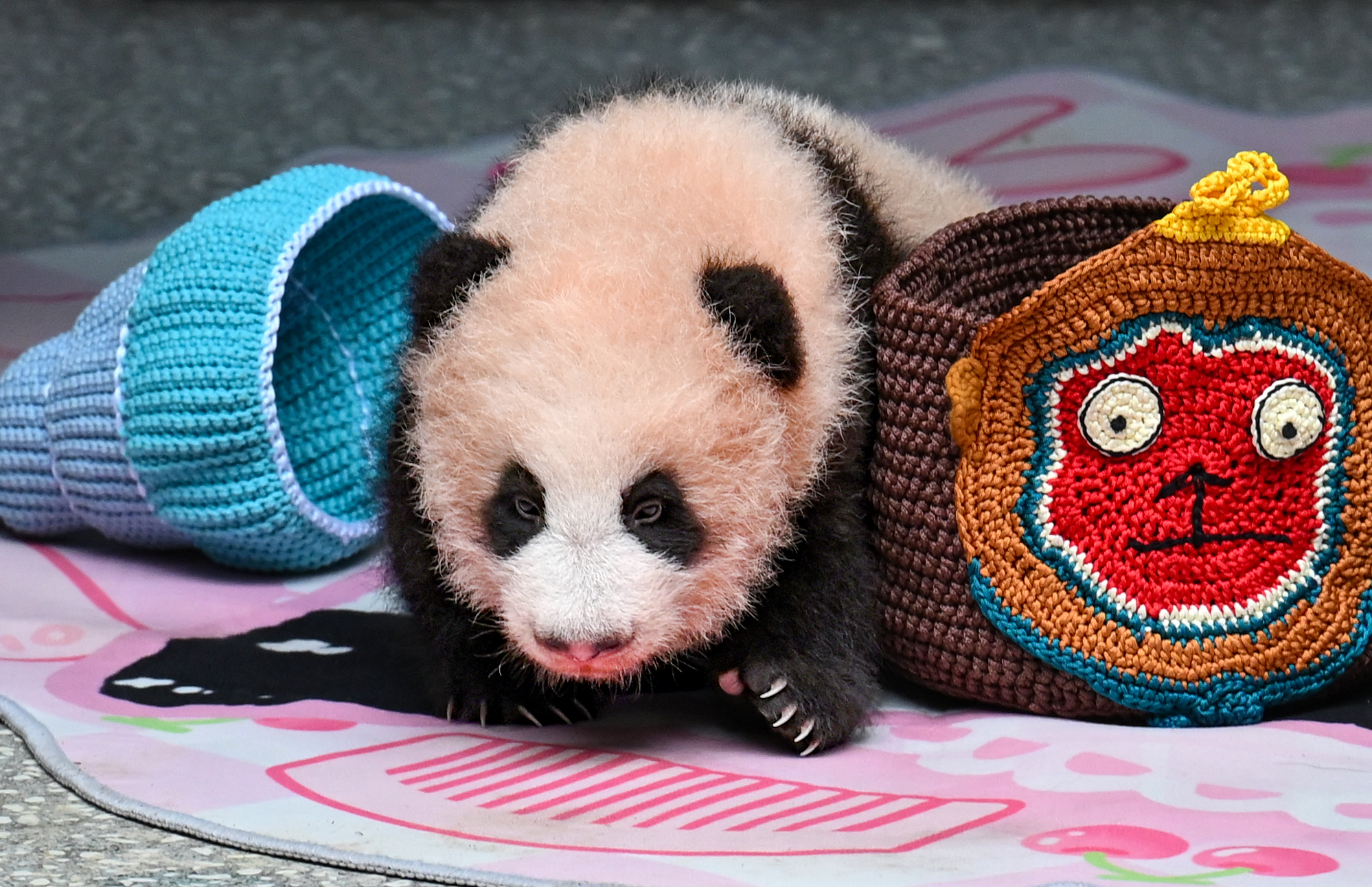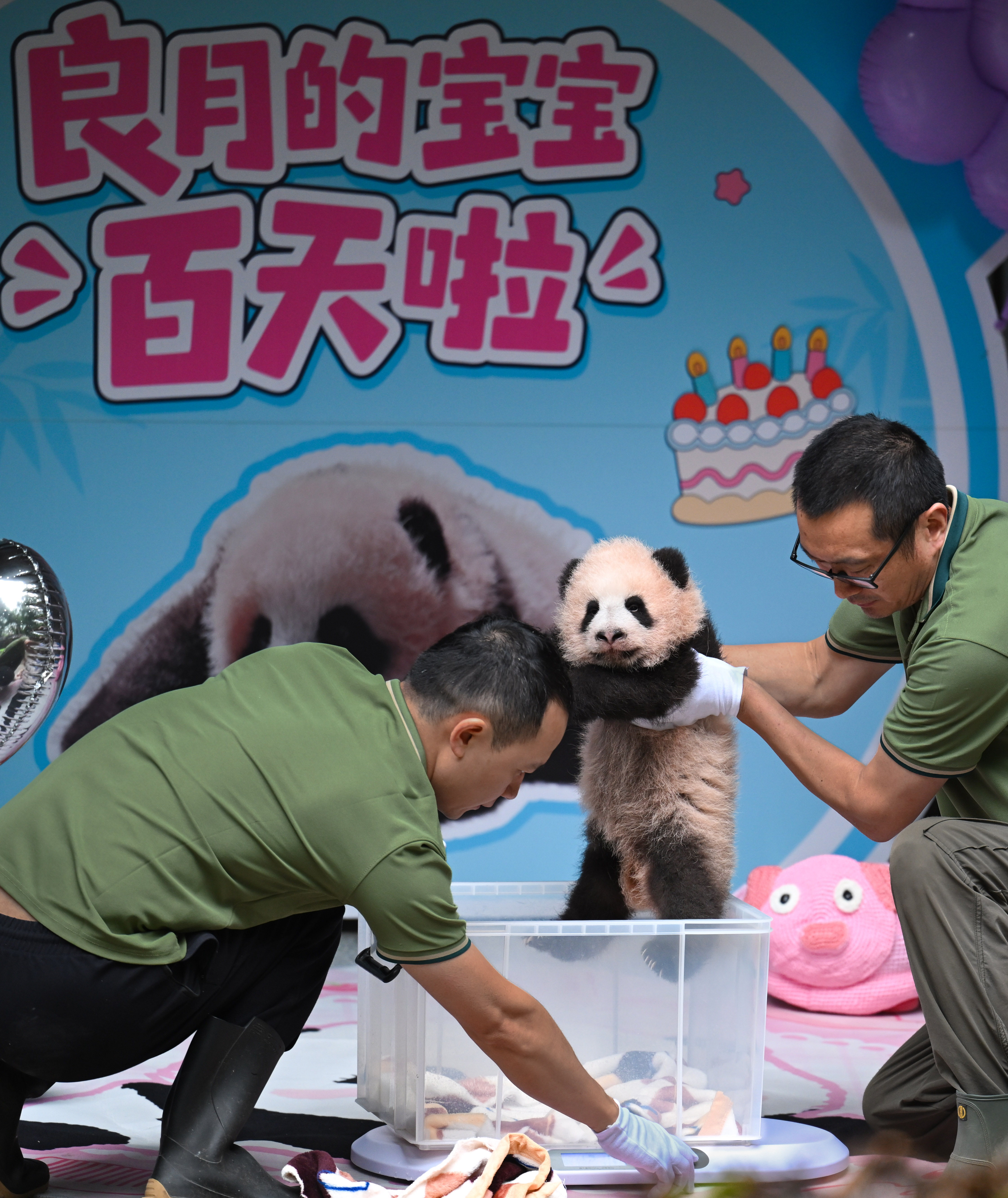 ▲10月20日,重庆动物园,刚满百天的大熊猫宝宝来到见面会中央,显得落落大方。记者 张锦辉 摄