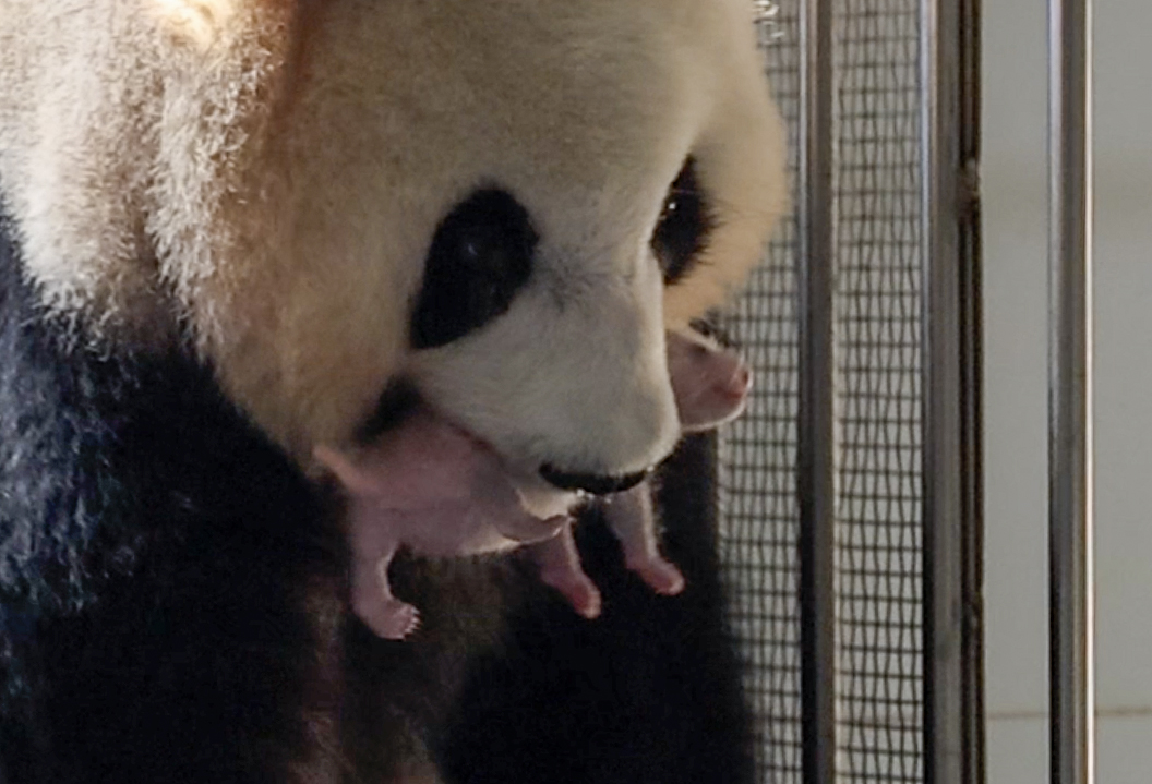 ▲2025年7月,重庆动物园,大熊猫“良月”在照顾自己的宝宝。(重庆动物园供图)