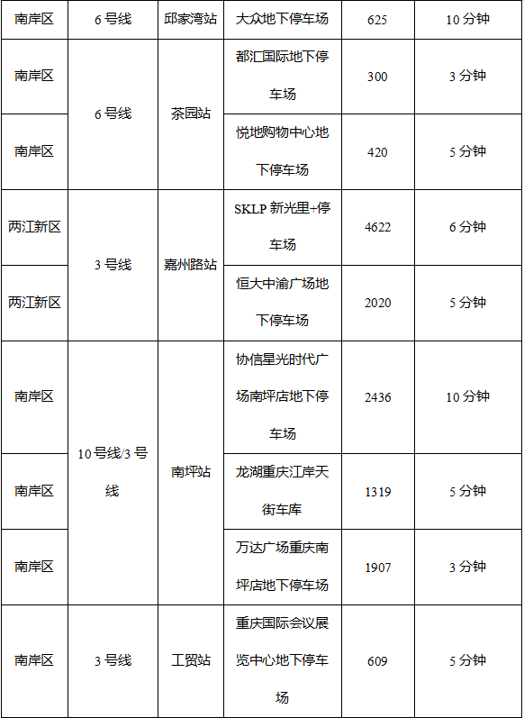 上游新闻记者从重庆市停车管理事务中心获悉,本次跨年夜推出“P+R”停车换乘服务,覆盖5大区域共28个停车场(36420个停车位)。其中,两江新区6个停车场(11858个停车位)、沙坪坝区4个停车场(4060个停车位)、渝中区4个停车场(5953个停车位)、九龙坡区5个停车场(6369个停车位)、南岸区9个停车场(8180个停车位)。所有停车场均已完善步行至轨道入口的指示标识(步行时间最短2分钟、最长18分钟),相关部门同步实现停车场饱和度数据共享,将通过“定制导航”实时推荐闲置车位,保障市民停车换乘顺畅。