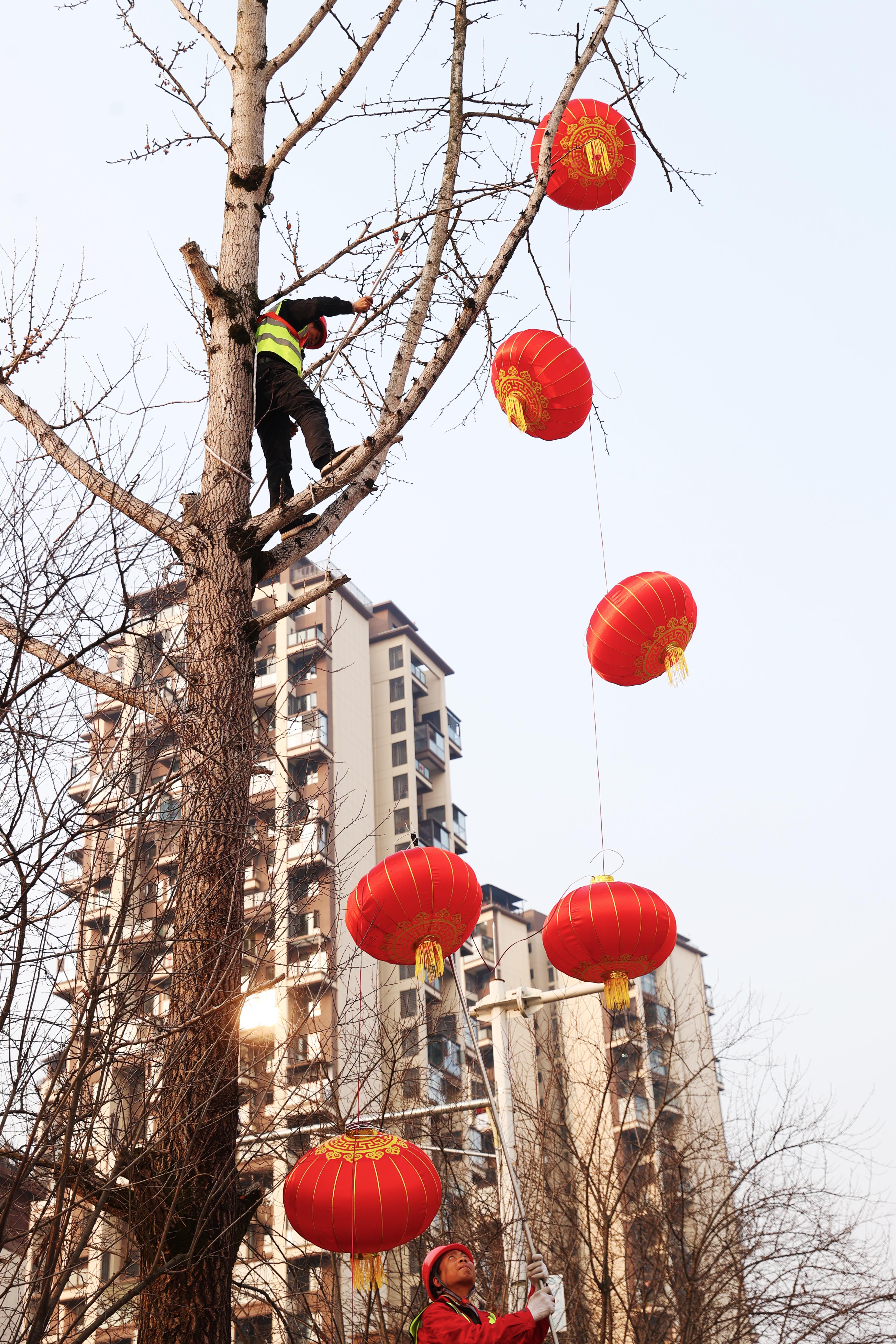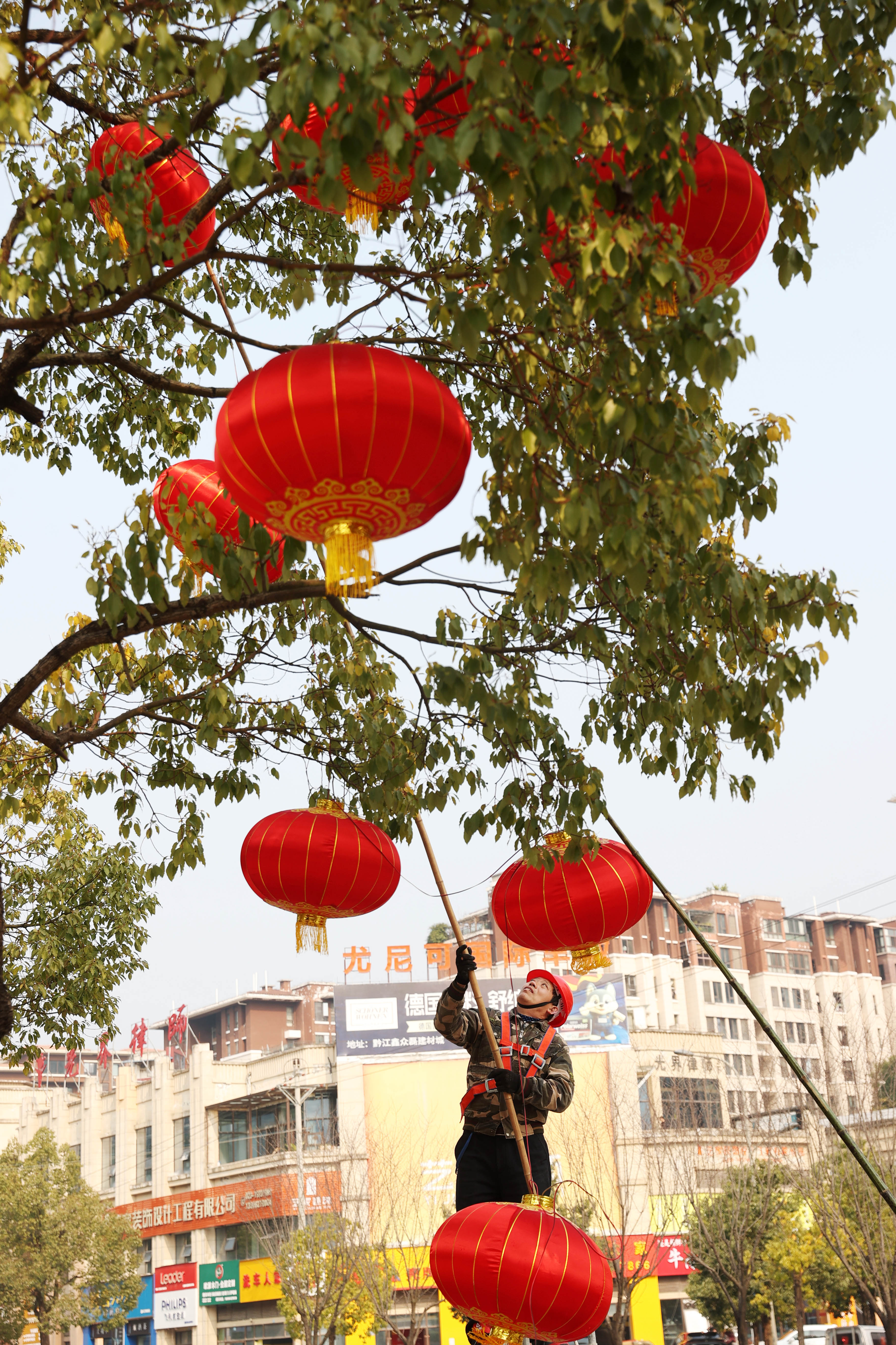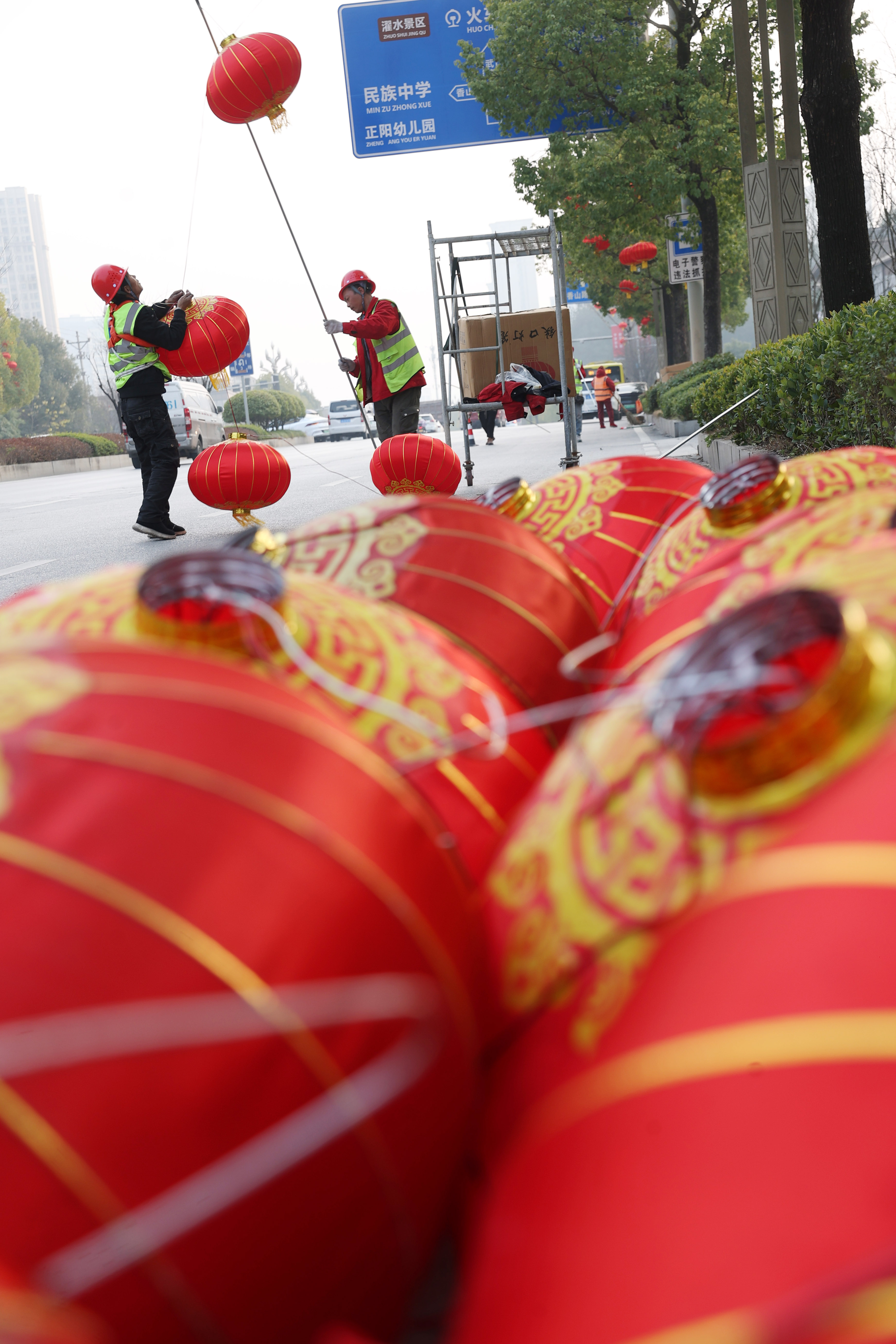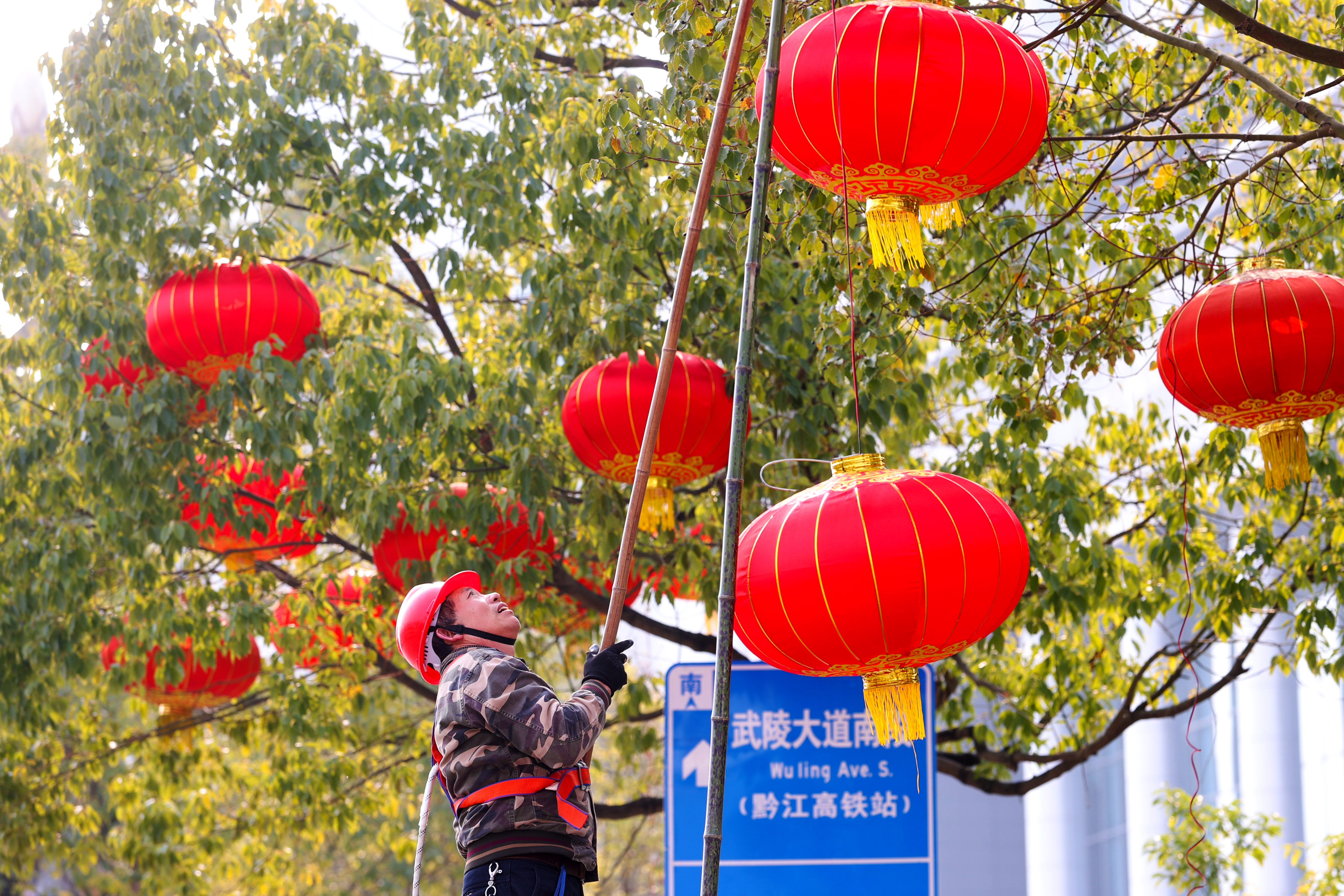 连日来,灯饰安装工人在黔江城区的大街小巷安装灯笼,营造出浓浓的节日气氛,迎接新春佳节的到来。