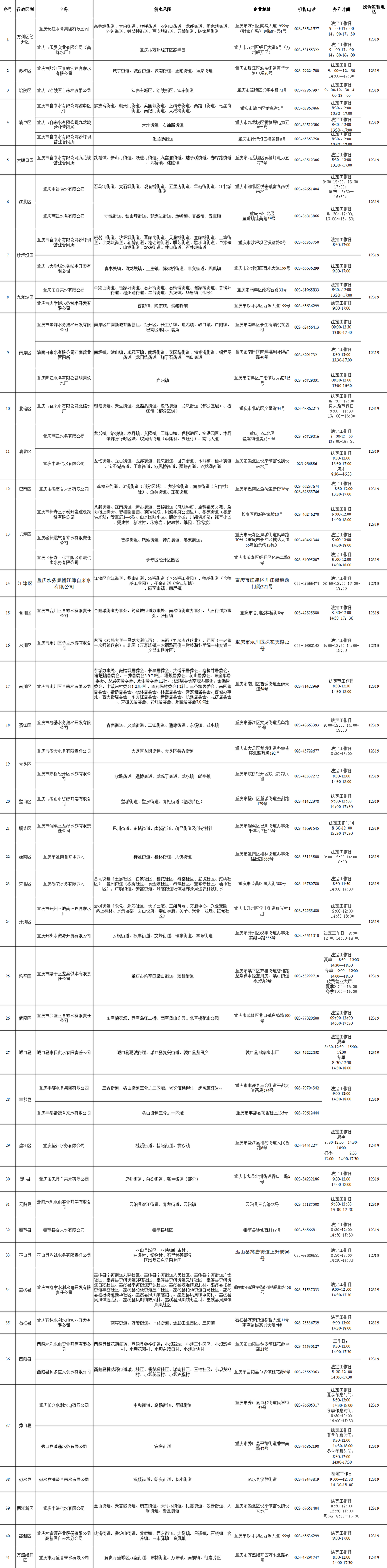 重庆市城市供水企业名录