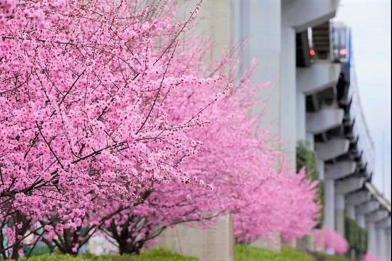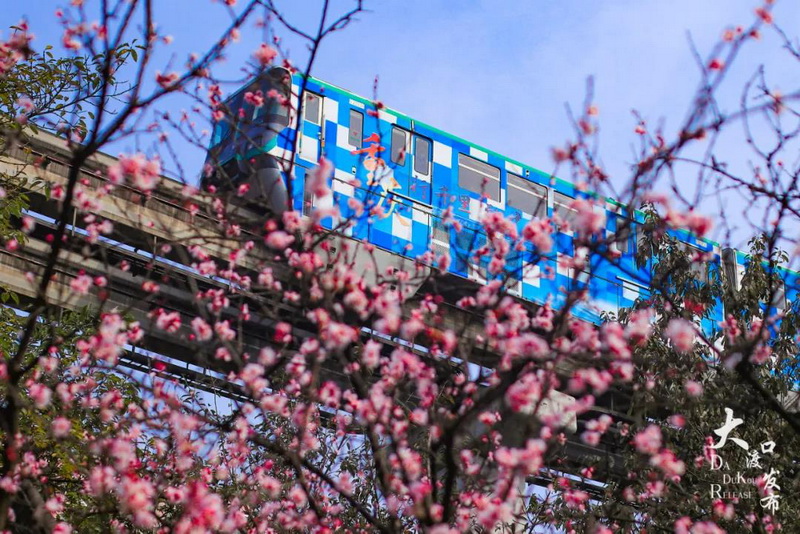飞驰而过的单轨列车与盛开的梅花,形成了大渡口一道靓丽的风景。乘坐轨道交通2号线在大渡口站下车,你会发现在春晖路、中华美德公园等处梅花与单轨列车同框的美景处处可见,随手一拍,就是梅花与单轨列车同框的“大片”。