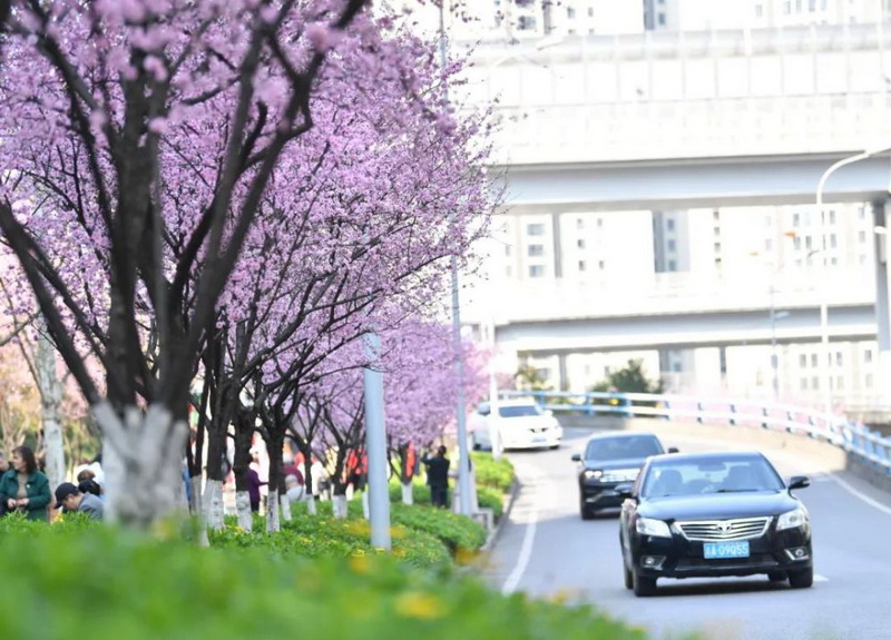 在九龙坡区,有一条路随着春天的到来开始“蹿红”,引来路人争相到此打卡。乘坐轨道交通2号线在谢家湾站下车,走进南北大道万象城路段,数百米长的人行道上粉红色梅花争相怒放,花瓣层层叠叠,相互簇拥、紧紧依偎着枝干,美不胜收。