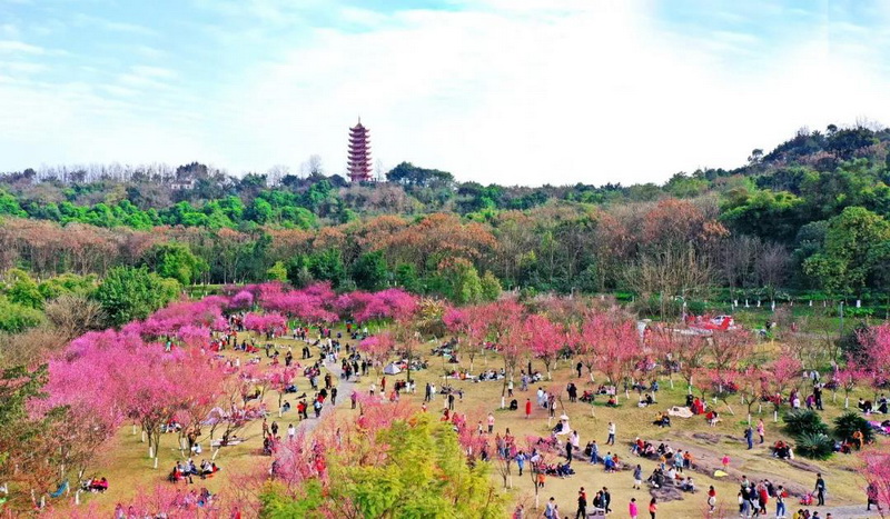 迎宾公园内600余株醉寒春樱花已陆续开放,市民纷纷约上家人好友,赏花拍照、聊天晒太阳,享受春日的休闲时光。