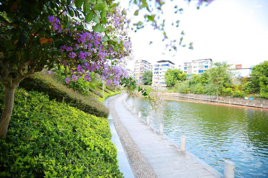 在滨江路康羽桥段,一抹靓丽的紫色与璀璨的阳光、澄澈的河水交相辉映。