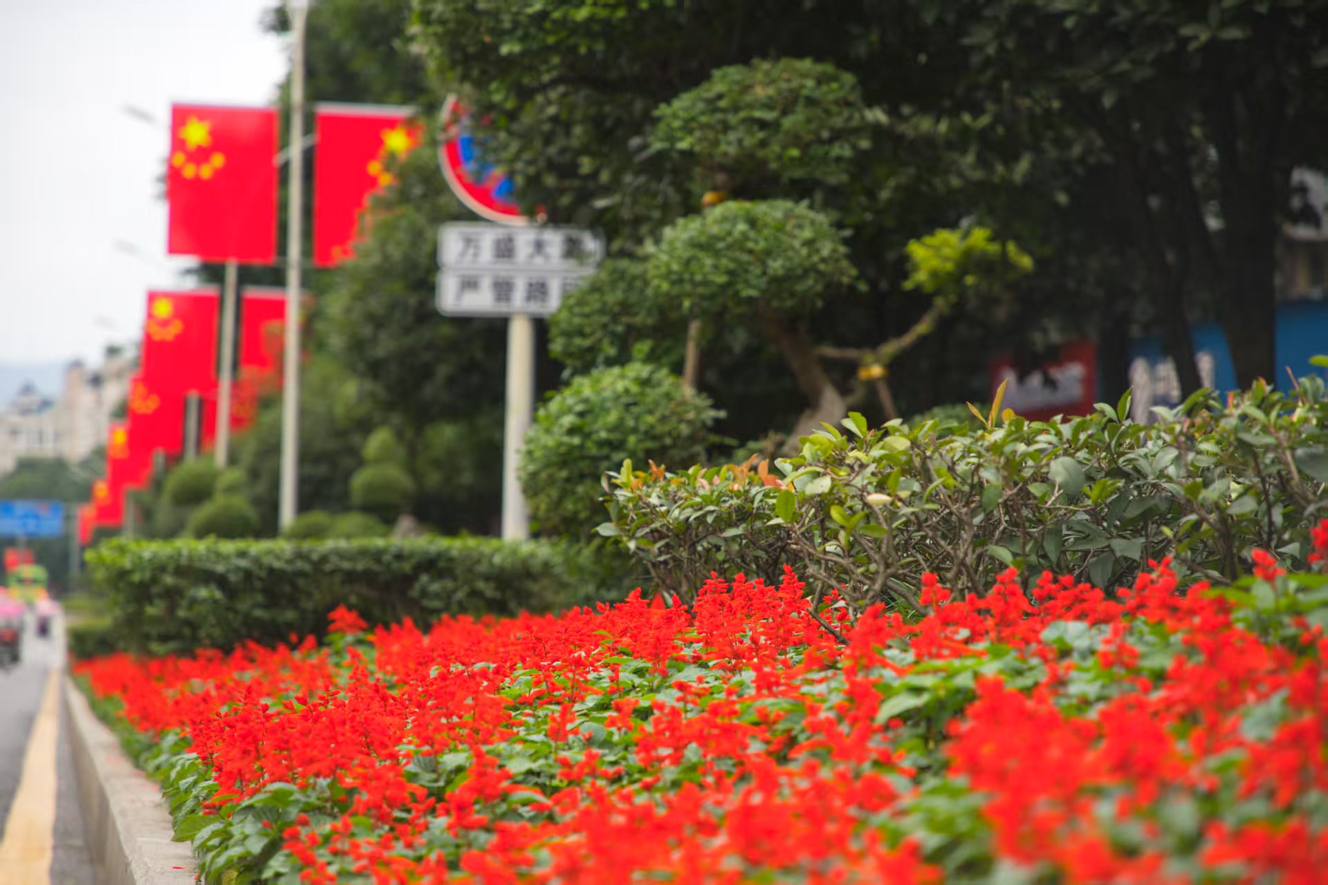 二是花卉妆点添彩景。精选西洋鹃、孔雀草、一串红、等10余种花期长、色彩艳丽时令花卉,覆盖高速路口、万盛大道、子如广场等城区多个关键节点及转盘7000余平方米,通过科学搭配、组团造景,打造多层次立体花境,实现城市颜值提档升级。