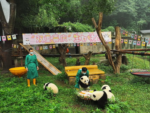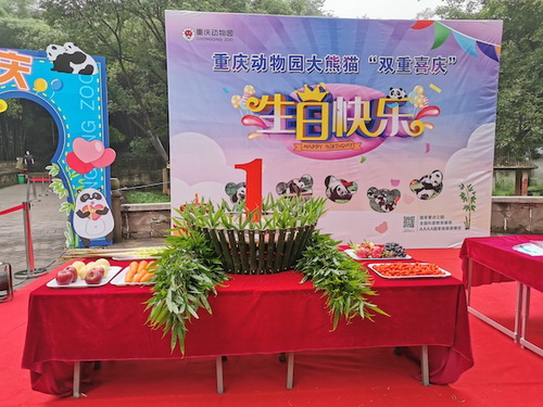 华龙网6月23日消息 去年6月23日,重庆动物园大熊猫“兰香”产下了双胞胎兄弟“双双”、“重重”,大熊猫“莽仔”产下双胞胎姐妹“喜喜”、“庆庆”。很快一年过去了,这四小只今(23)天刚好满周岁。重庆动物园特意举行生日庆典,邀请熊猫四宝的取名者、6月23日生日的市民、喜爱四宝的游客等到现场参加,祝福大熊猫“双重喜庆”健康成长。