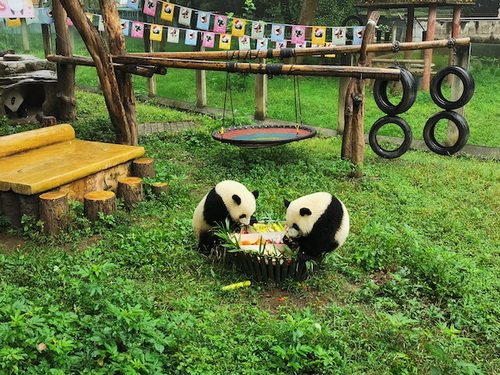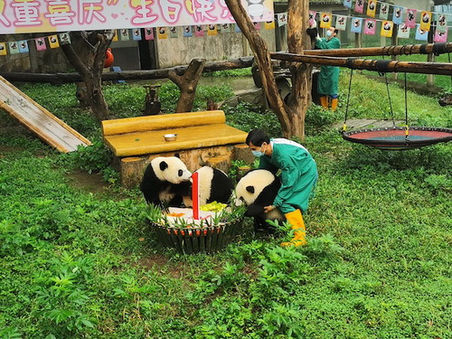 过生日怎么能少得了蛋糕!重庆动物园特意制作了九宫格火锅的生日蛋糕,整个蛋糕底座是火锅样式,然后现场游客和保育员将大熊猫爱吃的竹叶、竹笋、苹果、胡萝卜等做食材切好,放入九宫格内,做成“双重喜庆”的专属生日蛋糕。由保育员将“火锅”蛋糕送入到“双重喜庆”运动场,大家一起唱生日歌,为双重喜庆送上满满祝福。