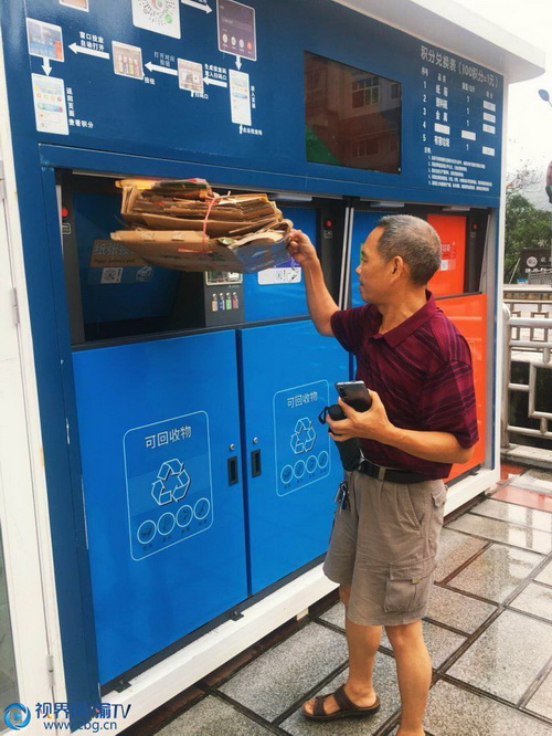视界网7月28日讯 “已积了7000多分,相当于70块钱,基本上家里的香皂、肥皂这些洗漱用品就不用再掏钱买了。”7月27日,家住忠县白公街道白公路社区居民乐先生把废纸壳放进蓝色智能垃圾回收箱,手机上立马跳出了恭喜本次积分220分的字样。“现在可好啦,废品变成了礼品,让家里节省了不少开销。”