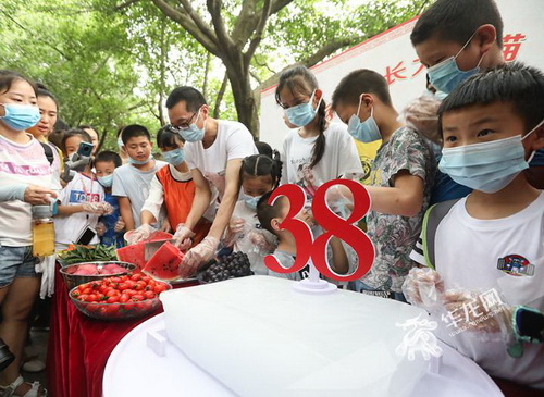 孩子们为大熊猫“新星”准备生日蛋糕。