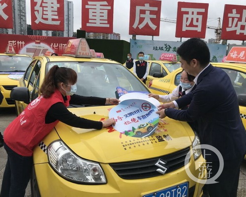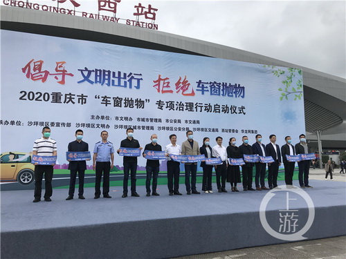 启动仪式上,文明志愿者、城管执法队员、出租车驾驶员、环卫工人等一线工作者代表,齐聚重庆西站广场,发出杜绝车窗抛物的倡议。