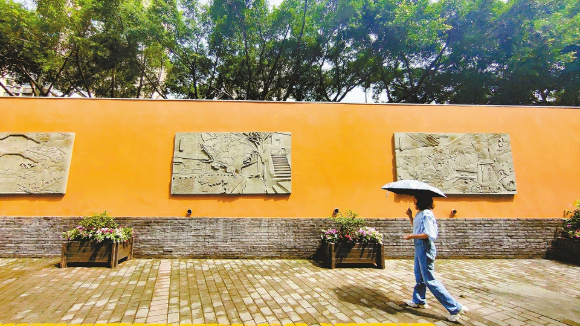 除此之外,北温泉街道还实施了辖区其他农贸市场的周边环境改造工程,铺装人行道多彩地坪、增设停车位、安装透水砖、铺设防腐木座椅……“我们还为部分农贸市场周边布置了文化、艺术墙。”北温泉街道城管服务中心负责人说。在308缙华农贸市场,一幅幅浮雕排列整齐,浮雕前的植物生机勃勃。而另一边,红色的文化墙和宣传标语,为308缙华农贸市场增添了文化气息。