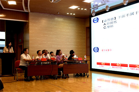 “公园、广场等公共场所的垃圾桶主要以哪四类为主?”过期食品属于哪种垃圾……”“装牛奶的纸盒属于什么垃圾?”在必答题环节,7个有备而来的参赛家庭沉着应对,按照顺序依次答题,比分不相上下。