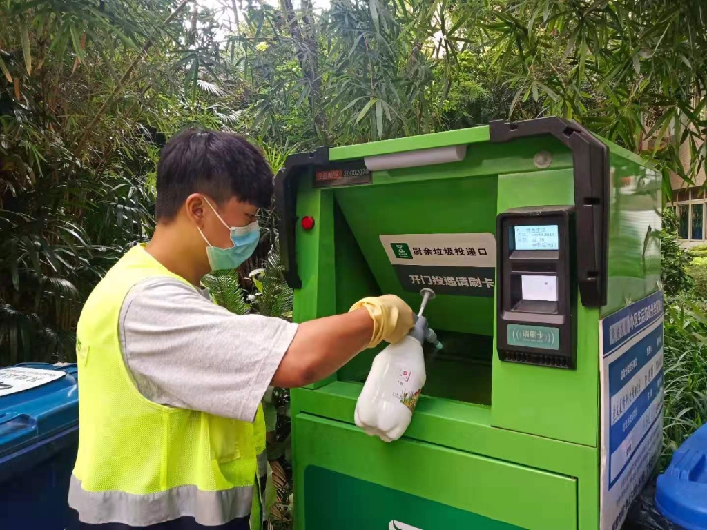 为了给居民创造一个干净卫生、整洁优美的生活环境,解决各小区垃圾点位垃圾桶及铁皮箱表面脏污、气味难闻等问题,每天早上,值班的垃圾分类指导员都会清洗垃圾桶,并对垃圾桶内外进行全面消毒消杀。