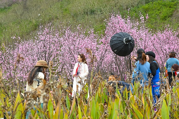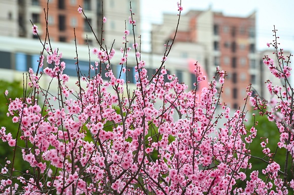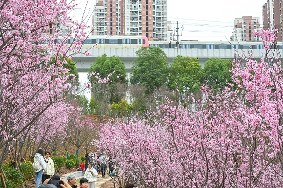 在康庄轨道站旁,粉色的美人梅花朵挂满枝头,远远望去宛若一片云霞。从站台驶出的轨道列车穿行于花海之中,恍若是从花丛间“开往春天的列车”。