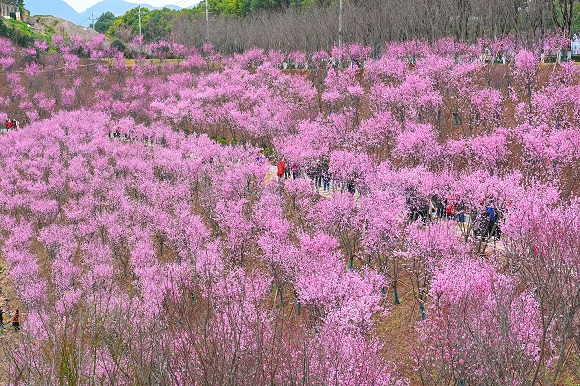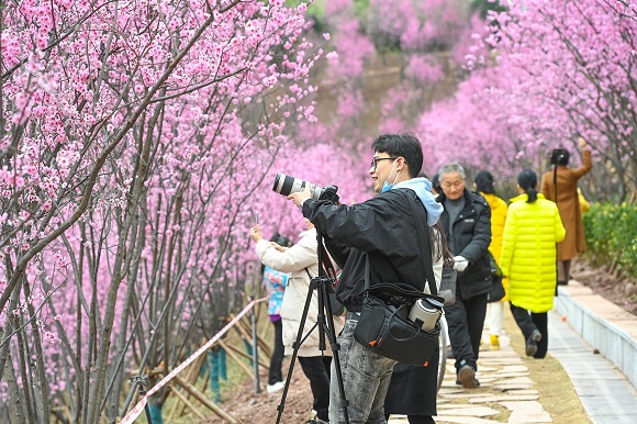 华龙网-新重庆客户端2月21日讯 近日,在重庆两江新区跳墩河公园百塘园(暂定名),1600余株美人梅盛开。粉粉的、香香的梅花形态似蝶,色彩艳丽,连接成片的“粉色花海”分外夺目,吸引了大量市民前往游玩。随着气温的逐步升高,未来几天还将有250株照收桃、300株碧桃盛开。