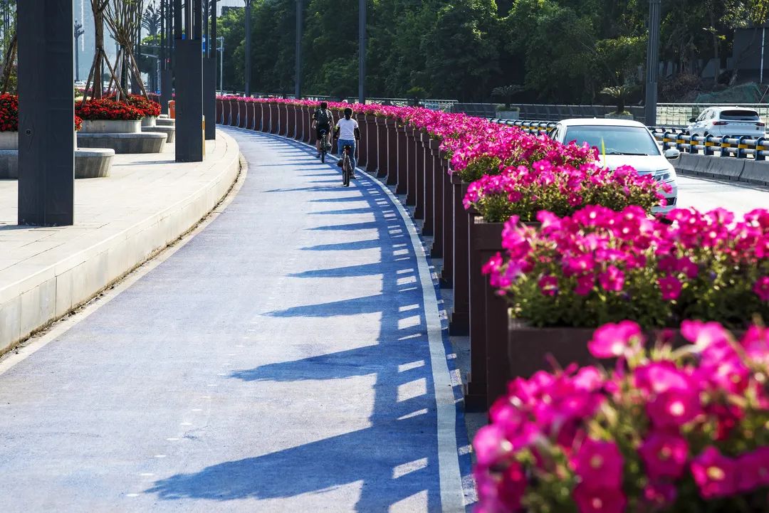 我想骑自行车!走吧,北滨路的自行车道平整还有鲜花护栏。
