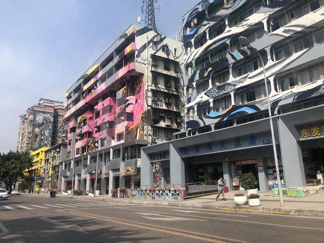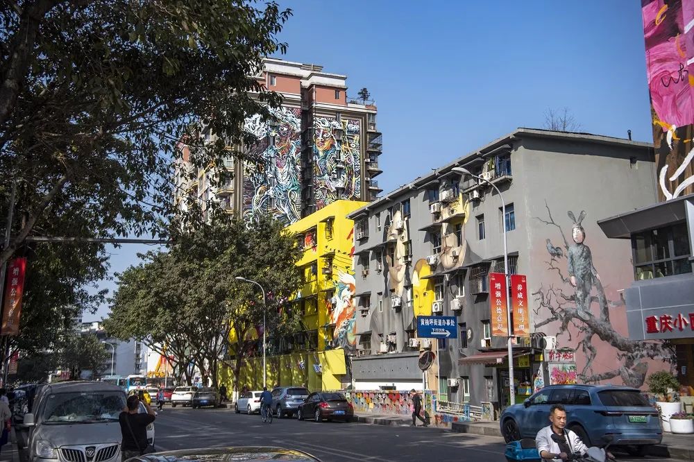沿着铁路小学往前走,一直到四川美术学院大门处,11栋沿街楼栋2万余平米的墙面都被穿上彩衣。这里是涂鸦艺术街,许许多多生动的墙绘作品正展现着热闹的生活场景。