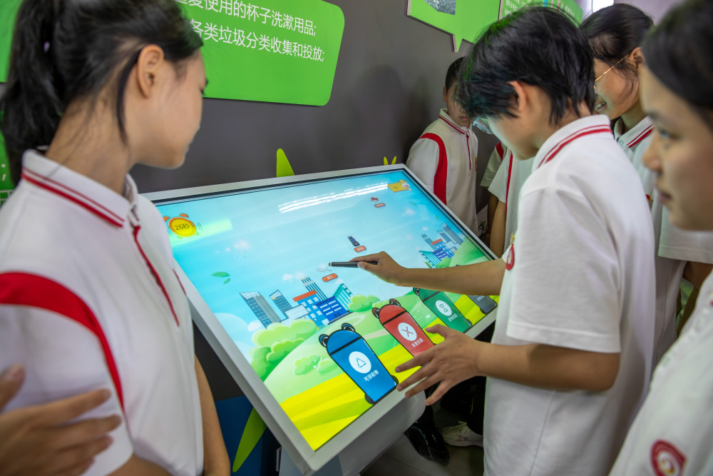 9月1日,南川区城市生活垃圾处置场,道南中学学生在智能大屏前模拟垃圾分类。