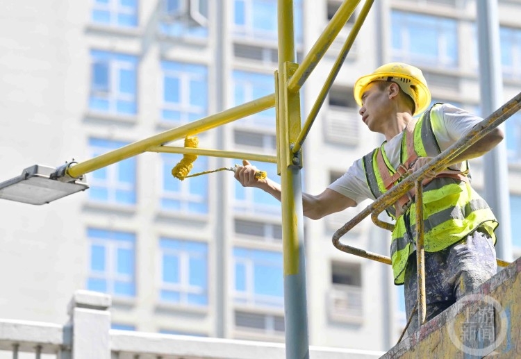 9月4日,记者在海尔路上看到,工人谭兴林正站在高空作业车升降台上,为灯杆刷上底漆。