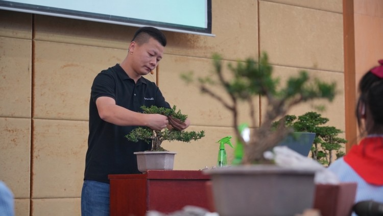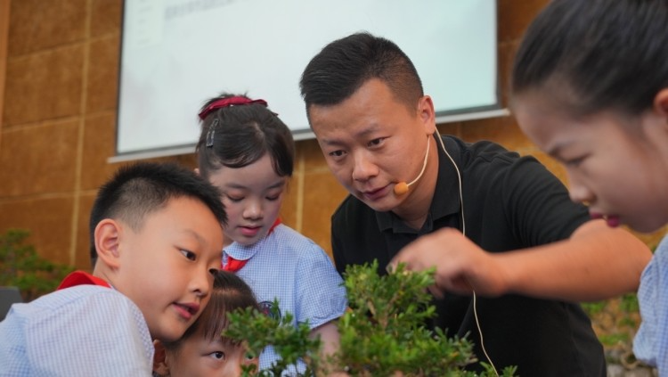 作为江北区中小学“五个一点”特色教育“特聘导师”,田原不仅讲解了盆景的基本理论知识,还现场教同学们制作盆景。