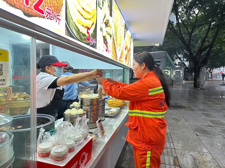 据重庆市九龙坡区石桥铺泰兴劳动者港湾环卫工人爱心早餐领取点负责人唐玲介绍,爱心早餐的供应时间为每天早上6:30至9:00,目前主要服务泰兴劳动者港湾附近渝州路、石杨路、石新路等路段的环卫工人,按照8元/人的餐标,以环卫工人自主选择的形式发放50余份免费早餐。