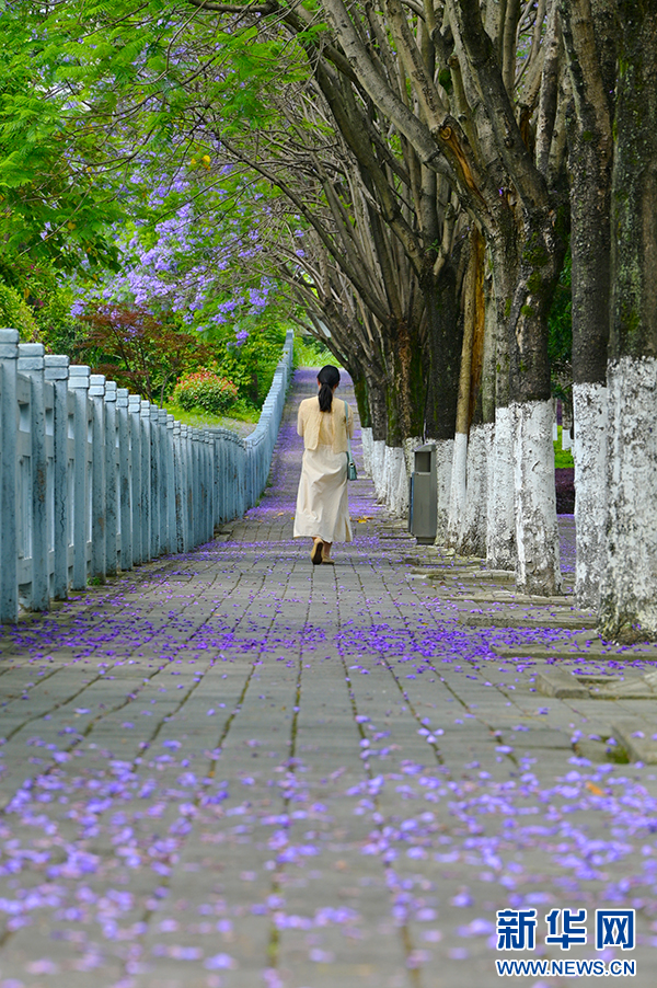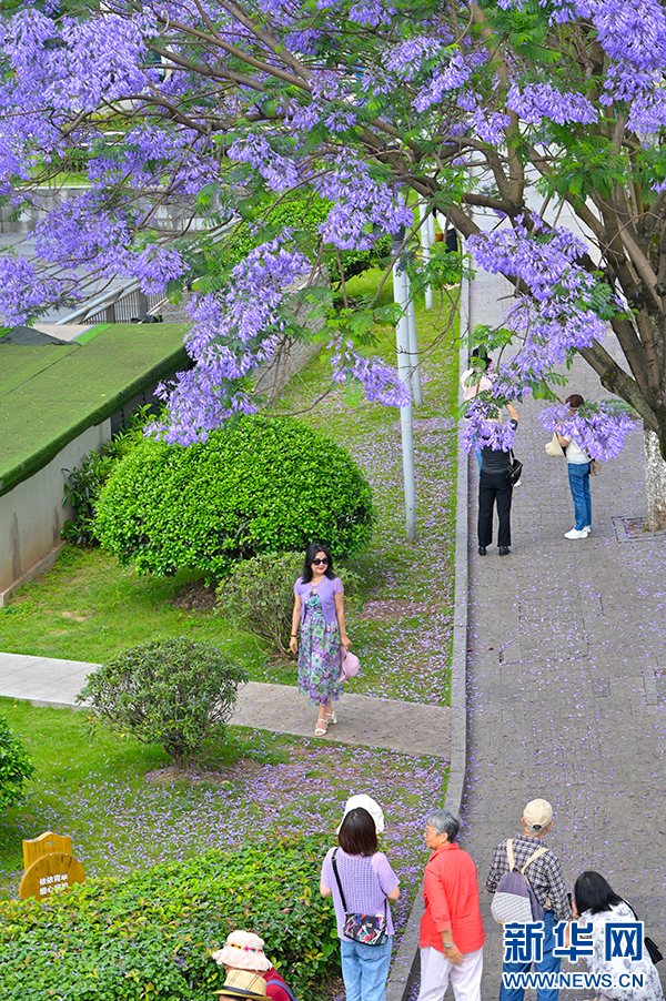 市民在街头打卡蓝花楹美景。