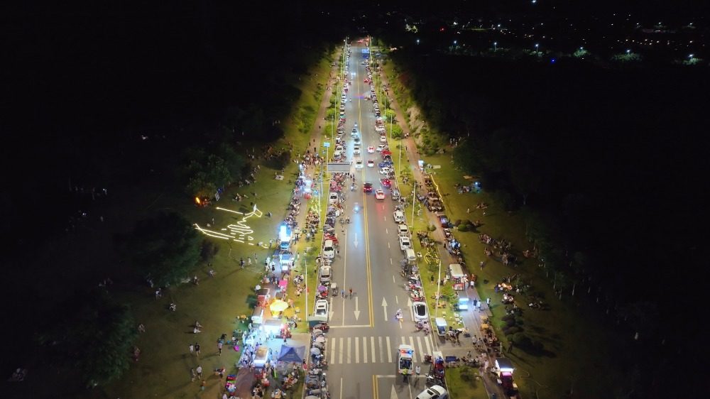 在铜梁城区龙腾大道西段,一条原本寻常的城市道路悄然“变装”——每天18点后,它不再是车流穿梭的通道,而是化作一条长达1.2公里的“潮汐夜市”。