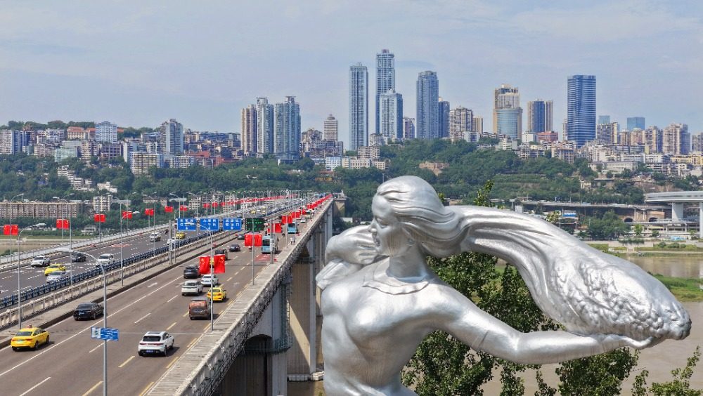 ▲2025年9月18日,重庆石板坡长江大桥上,雕塑“秋”与五星红旗交相辉映。