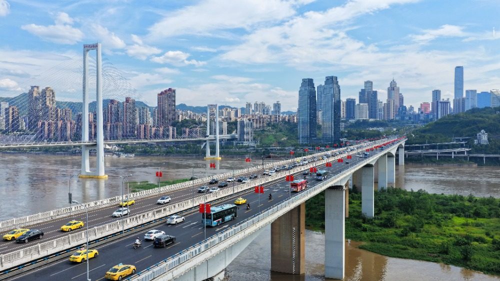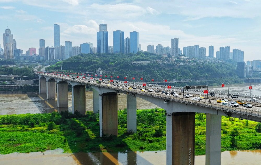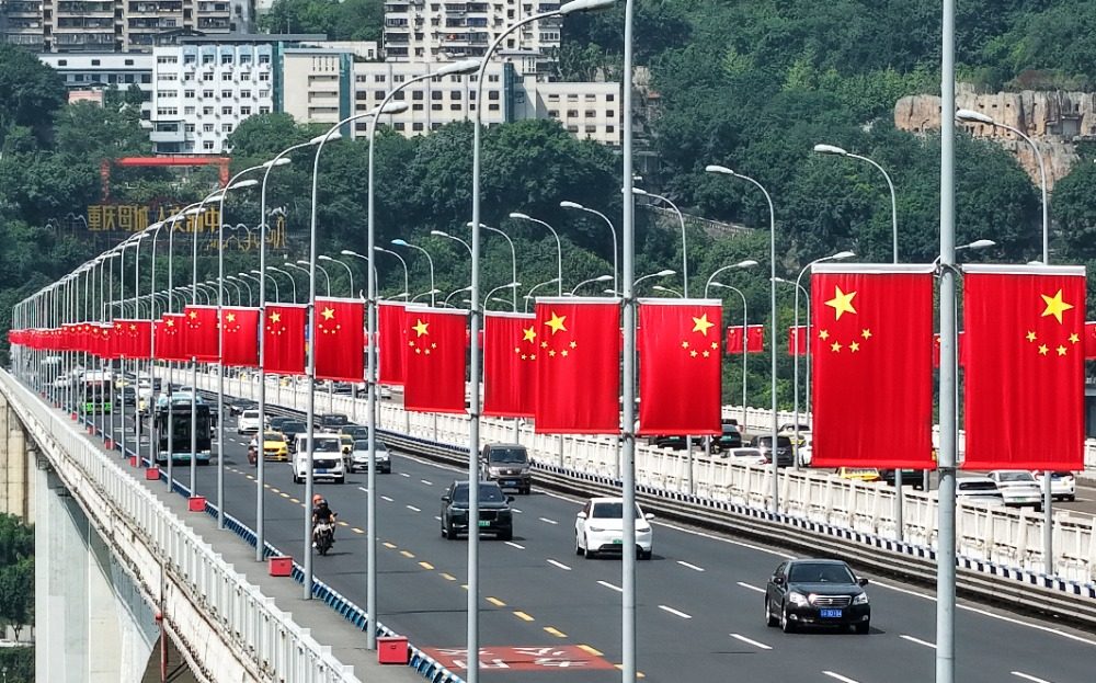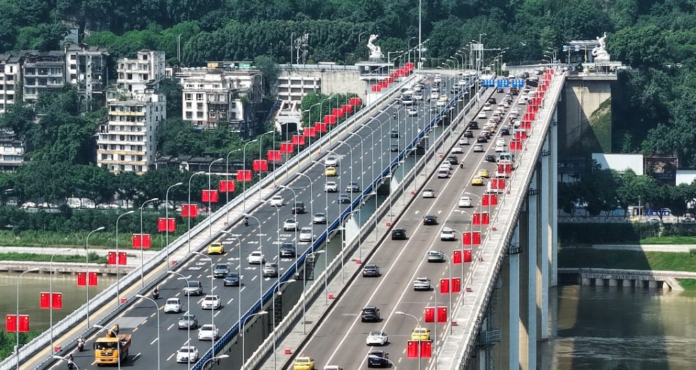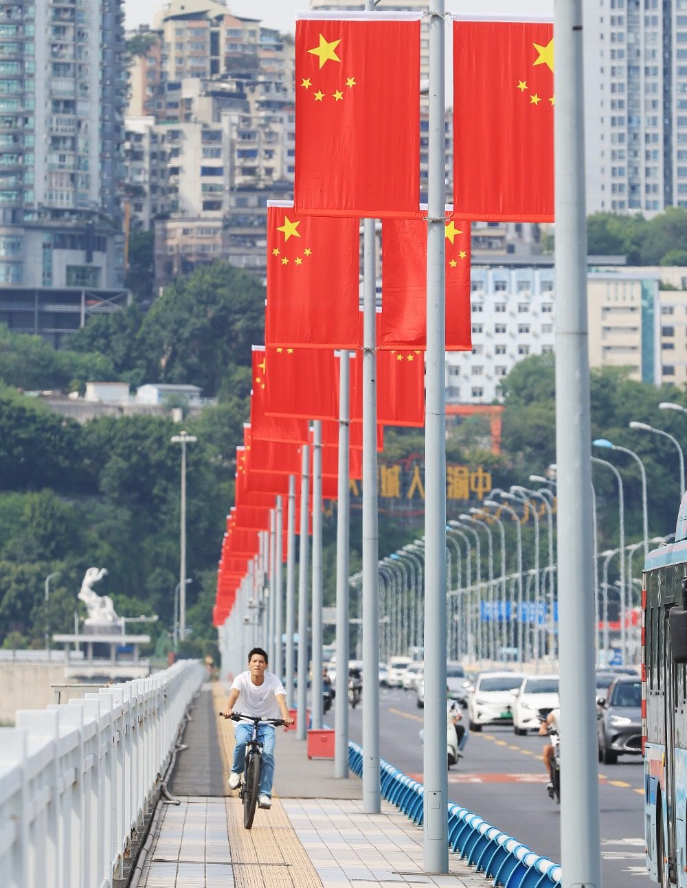 ▲9月18日,重庆石板坡长江大桥上,两旁挂满的五星红旗随风飘扬,鲜艳喜庆。