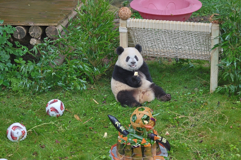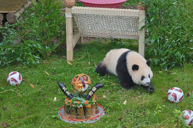 不一会儿,主角“奇颖”悠闲出场,它先是被色彩鲜艳的“足球”蛋糕所吸引,踱步上前,用鼻子好奇地嗅了嗅,随后伸出爪子轻轻拨弄,展现出浓厚的兴趣。最有趣的莫过于它用爪子拨弄足球,它时而抱着足球打滚,时而又试图将球推向迷你球门,可爱的动作引得现场观众阵阵欢笑。