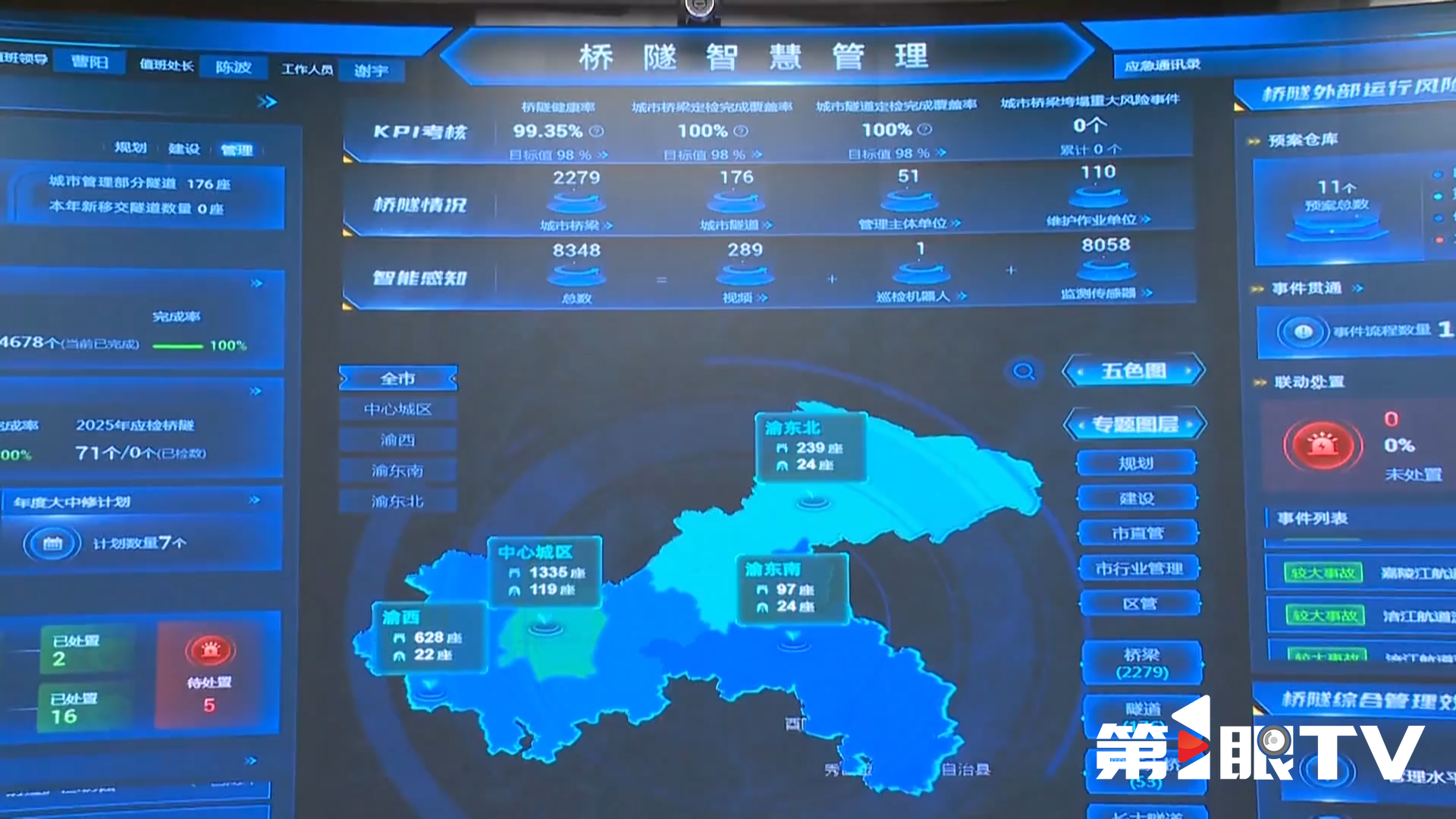 不仅是曾家岩大桥,走进市城市管理局的指挥大厅,全市2400余座城市桥隧的信息一目了然。通过桥隧智慧管理应用平台,“桥都”的每一次呼吸,都化作跳动的数据,实现“一屏统管”。