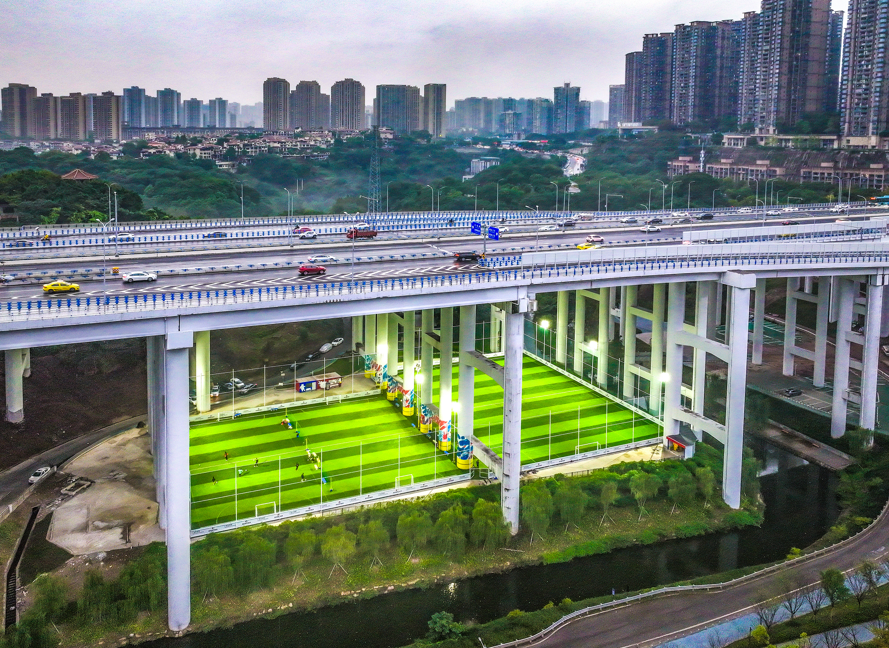 ▲11月3日,九龙坡区五台山足球公园,闲置地变身足球公园,桥下周边环境也得到极大美化(无人机照片)。