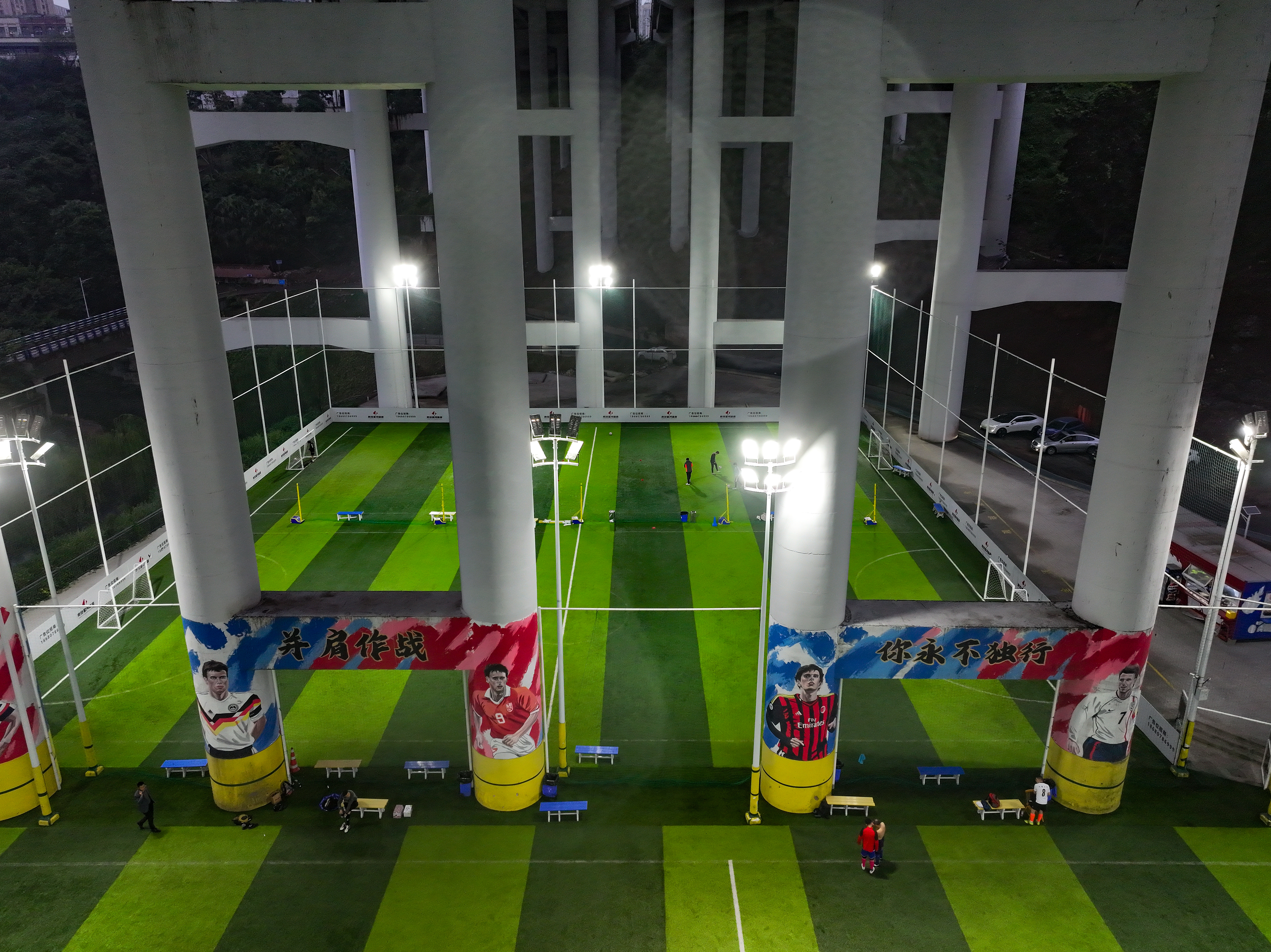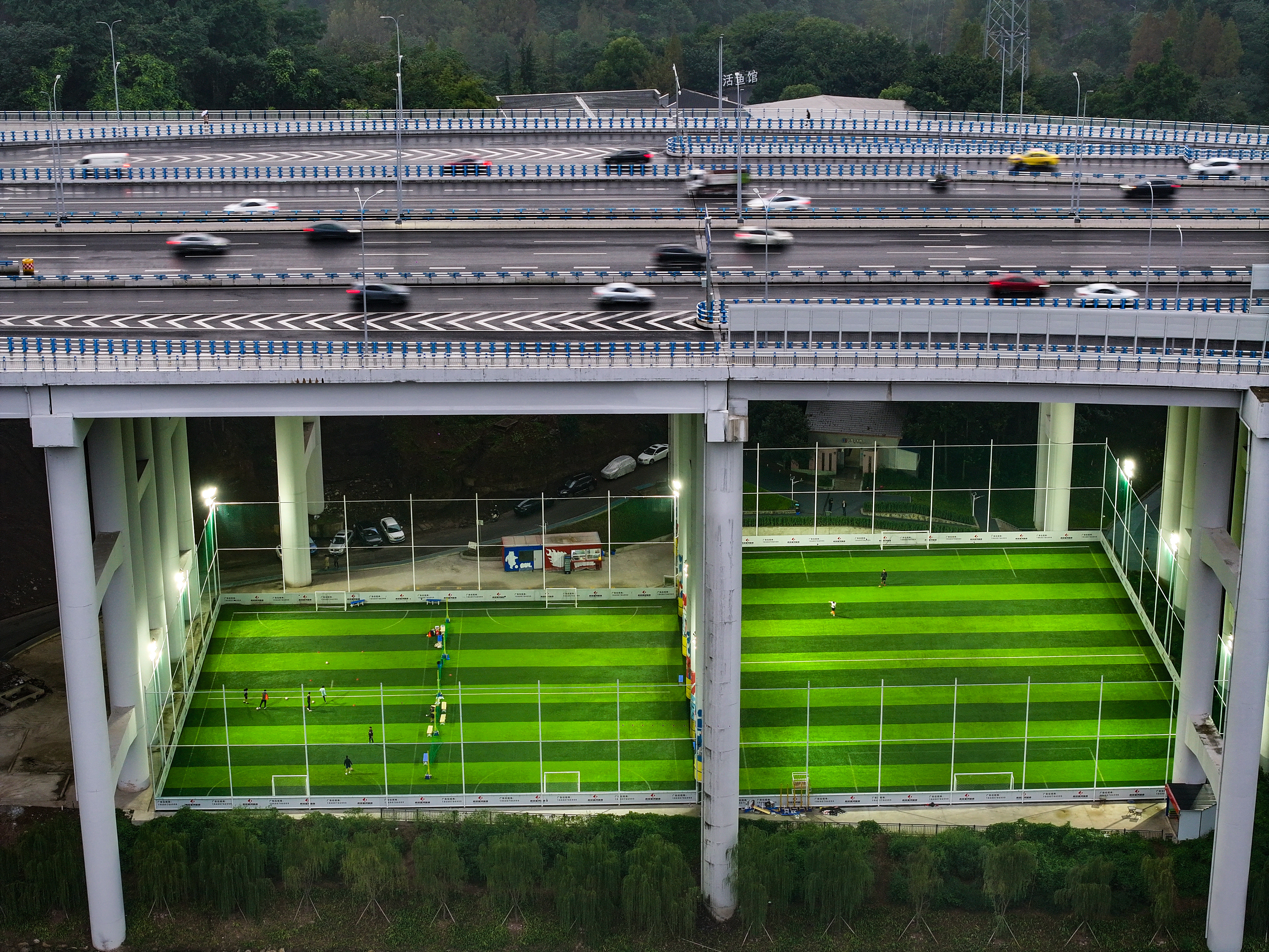 ▲2025年11月3日,九龙坡区五台山足球公园,足球爱好者正在桥下的球场内踢球健身(无人机照片)。