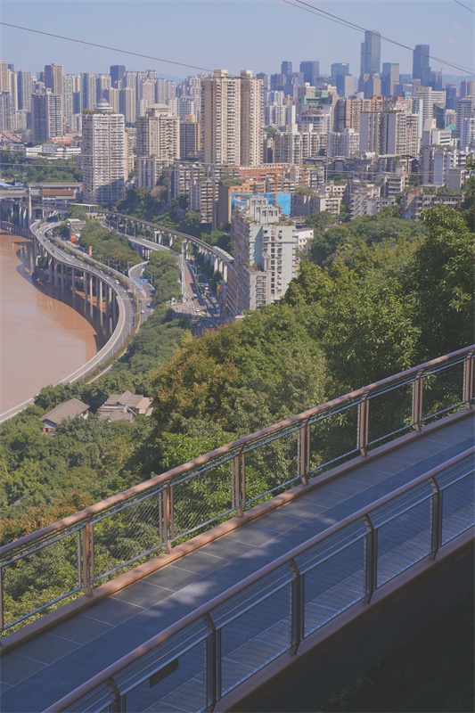 鹅岭栈桥犹如一条轻盈的缎带,巧妙缠绕于青山之间,将佛图关公园与鹅岭公园有机串联。这座全长460米、宽3米的栈桥,依托鹅岭公园外侧天然崖壁地形而建,沿山脊线蜿蜒伸展,形成一条视野开阔的观江览城步行通道。