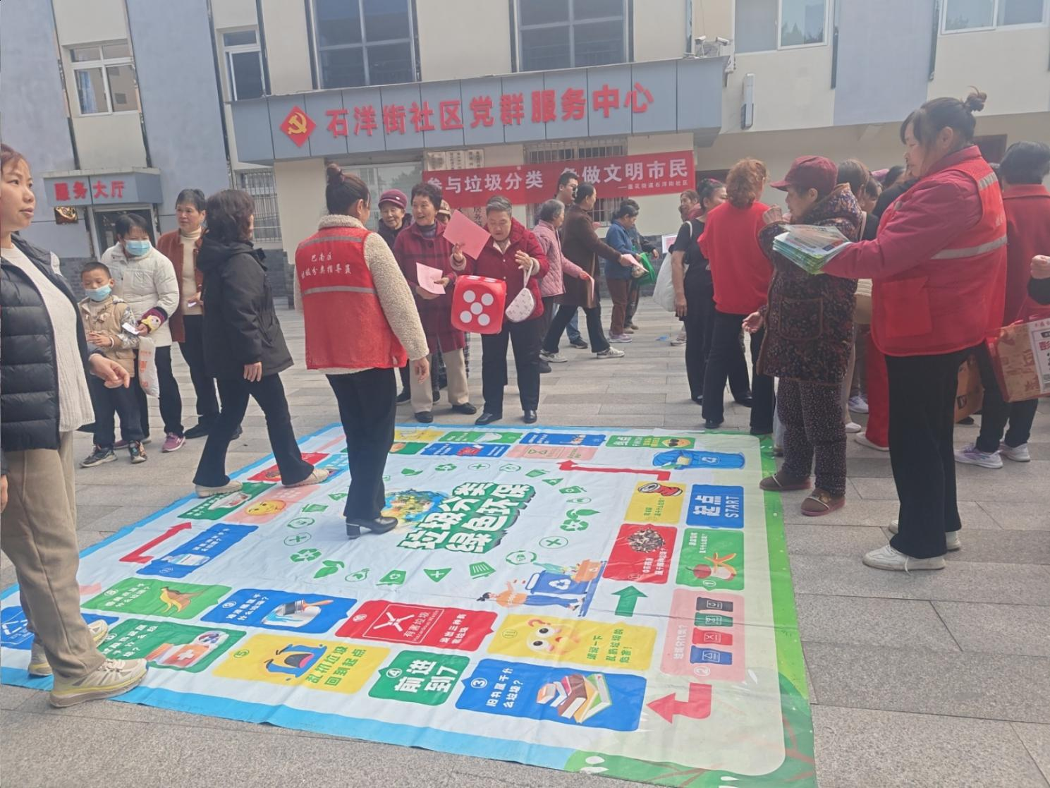 活动现场设在社区服务中心广场,工作人员与志愿者提前布置了巨型垃圾分类飞行棋——棋盘以四类垃圾桶的四种颜色为底色,标注“可回收物”“厨余垃圾”“有害垃圾”“其他垃圾”分类规则,搭配“答题闯关”“幸运前进”等趣味环节。居民们以家庭为单位组队参与,掷骰子前进的同时,需准确回答“废电池属于哪类垃圾”“剩菜剩饭如何投放”等问题,答对即可获得环保袋等小礼品。