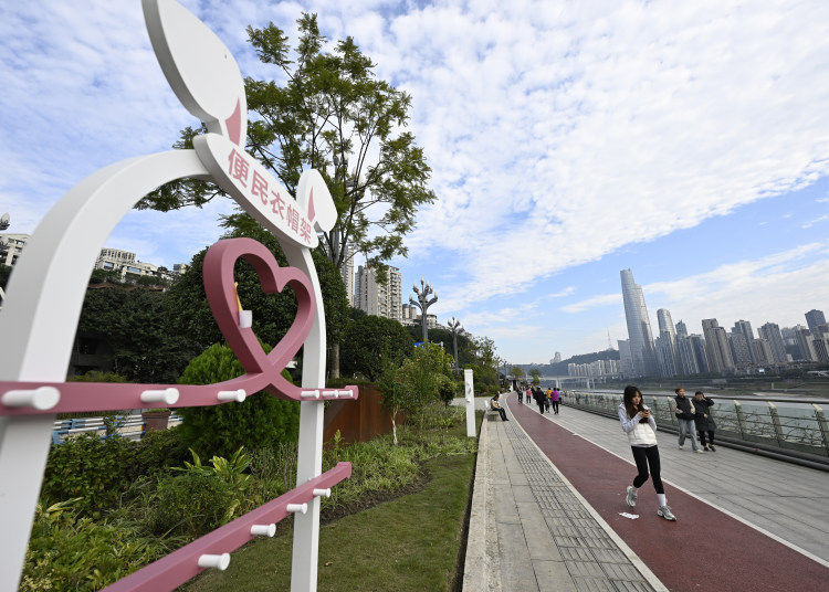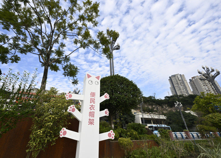除了视觉上的惊喜,实用型“城市家具”也同步升级。8组卡通造型的便民衣帽架分布在沿线,猫形、兔形的设计童趣满满,为市民提供了临时放置衣物、包包的空间。“出来散步有时走热了脱了外套没处放,这个衣帽架不仅方便,造型还这么可爱。”正在北滨路散步的李女士对这一设施赞不绝口。