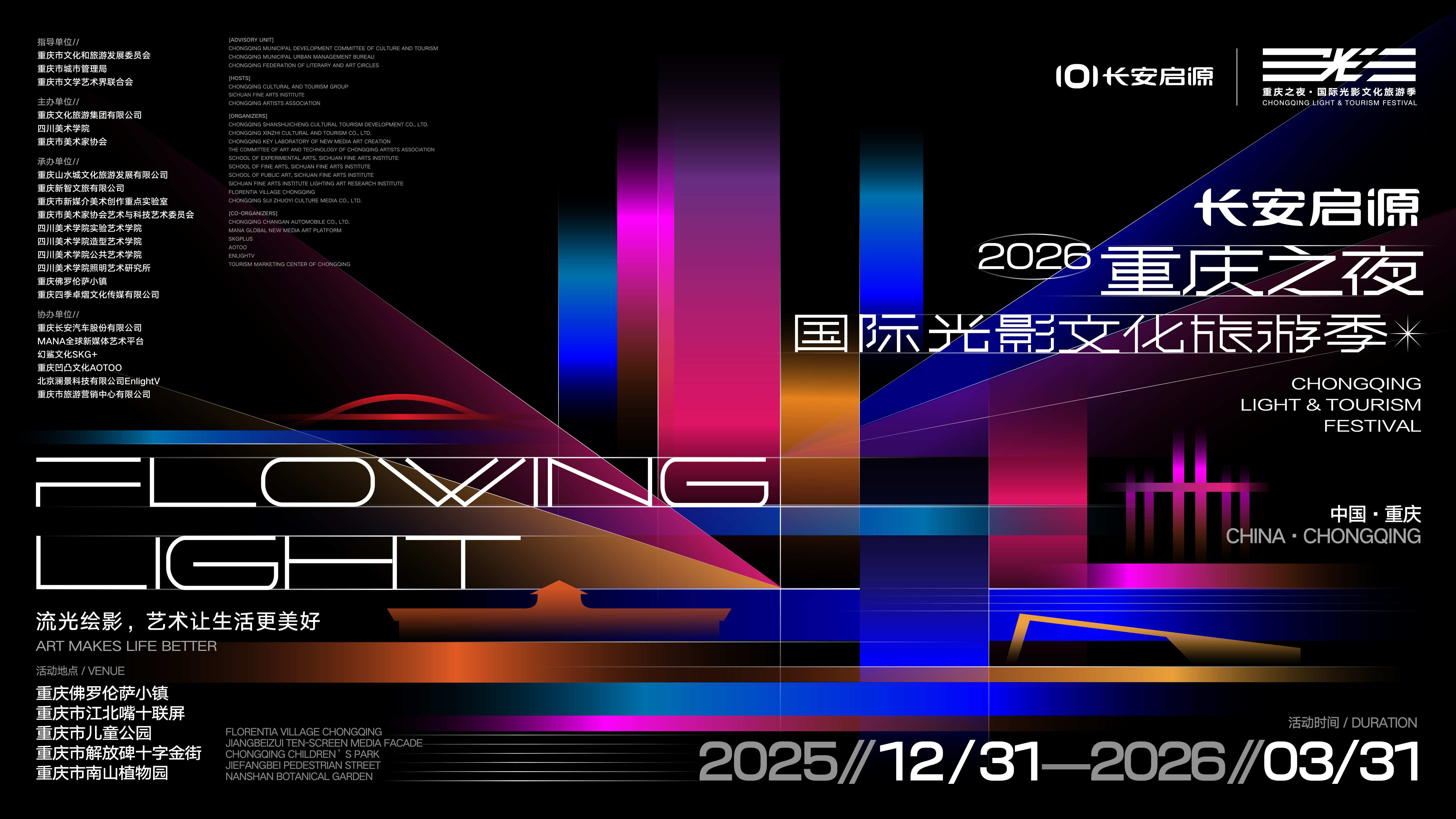 开幕盛典将于2026年1月1日晚8:00起在两江四岸灯光场景核心区重庆大剧院广场举行,届时将以重庆山、水、城、桥的璀璨夜景为幕,融合光影艺术表演、科技互动、文化演艺等多种形式,共同开启一场城市与光影的激情碰撞。
