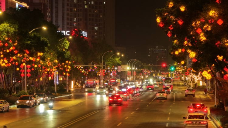 2025年12月23日晚,重庆市长寿区2026年迎春灯饰正式点亮,菩提大道、桃源大道等城区主要道路流光溢彩,浓浓的年味扑面而来,为市民提前送上新春祝福。