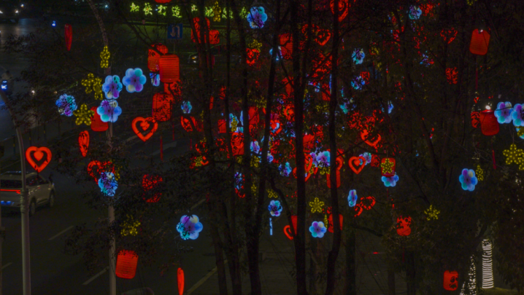此次迎春灯饰布设以城区主干道为核心,行道树上悬挂了红色灯笼、心形灯饰、玲珑球、菱形灯笼等各类灯饰,五彩灯光交织辉映,将街道装扮得绚丽多姿,形成了一道道靓丽的城市夜景风景线,市民行走其间,尽赏城市夜色之美。