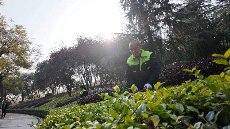 针对园内海枣树、木芙蓉、紫薇等乔木及花灌木,养护人员开展精细化整形修剪作业。
