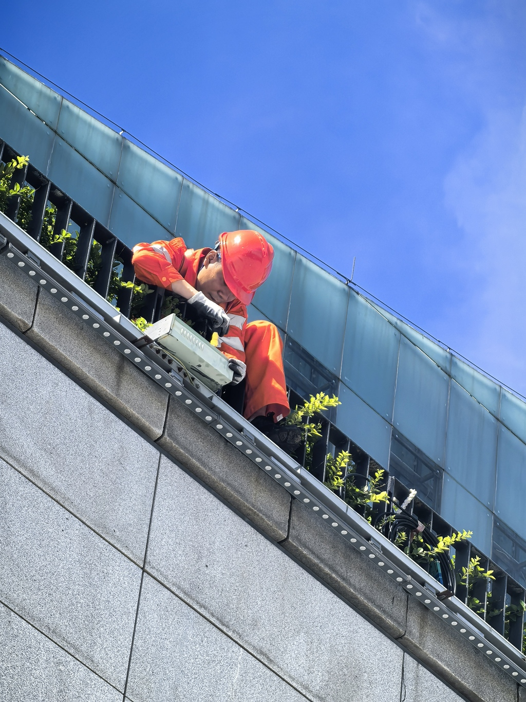 “超高空很难保持平衡。”江海坐在悬挂于桥塔外侧的作业板上,江风呼啸,板子轻微打转。他握紧工具钳,克服心理恐惧,探身去够一盏鸟巢灯——灯罩里积了灰,线路接头有轻微老化痕迹。更换、缠胶带、测试,一套动作行云流水。