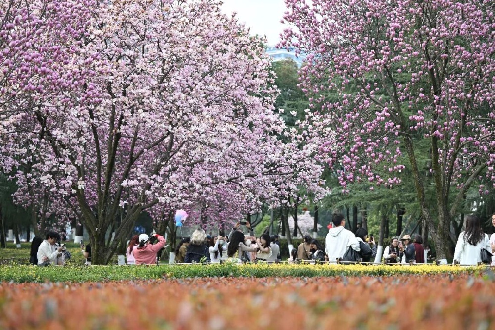▲2月26日,重庆中央公园,玉兰花迎来盛花期,不少市民漫步花间,尽享惬意春光。