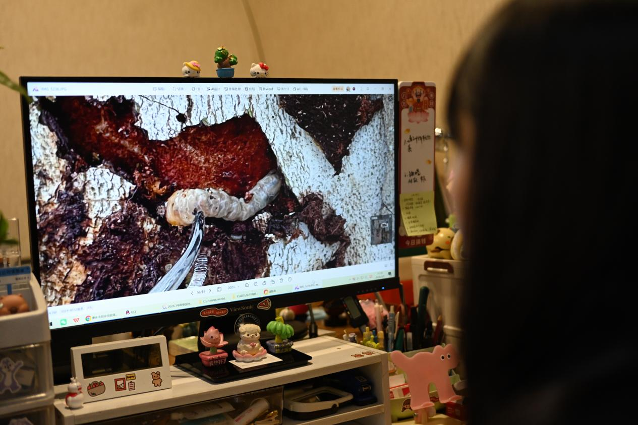 周冰颖介绍,5月份的时候,他们将花绒寄甲的卵卡释放在虫洞口,一周左右就能孵化出来,其幼虫寄生于光肩星天牛、星天牛等幼虫上,阻止天牛生长。几个月后,再释放一批管式肿腿蜂成虫进行交替防治,从而达到长期防治效果。
